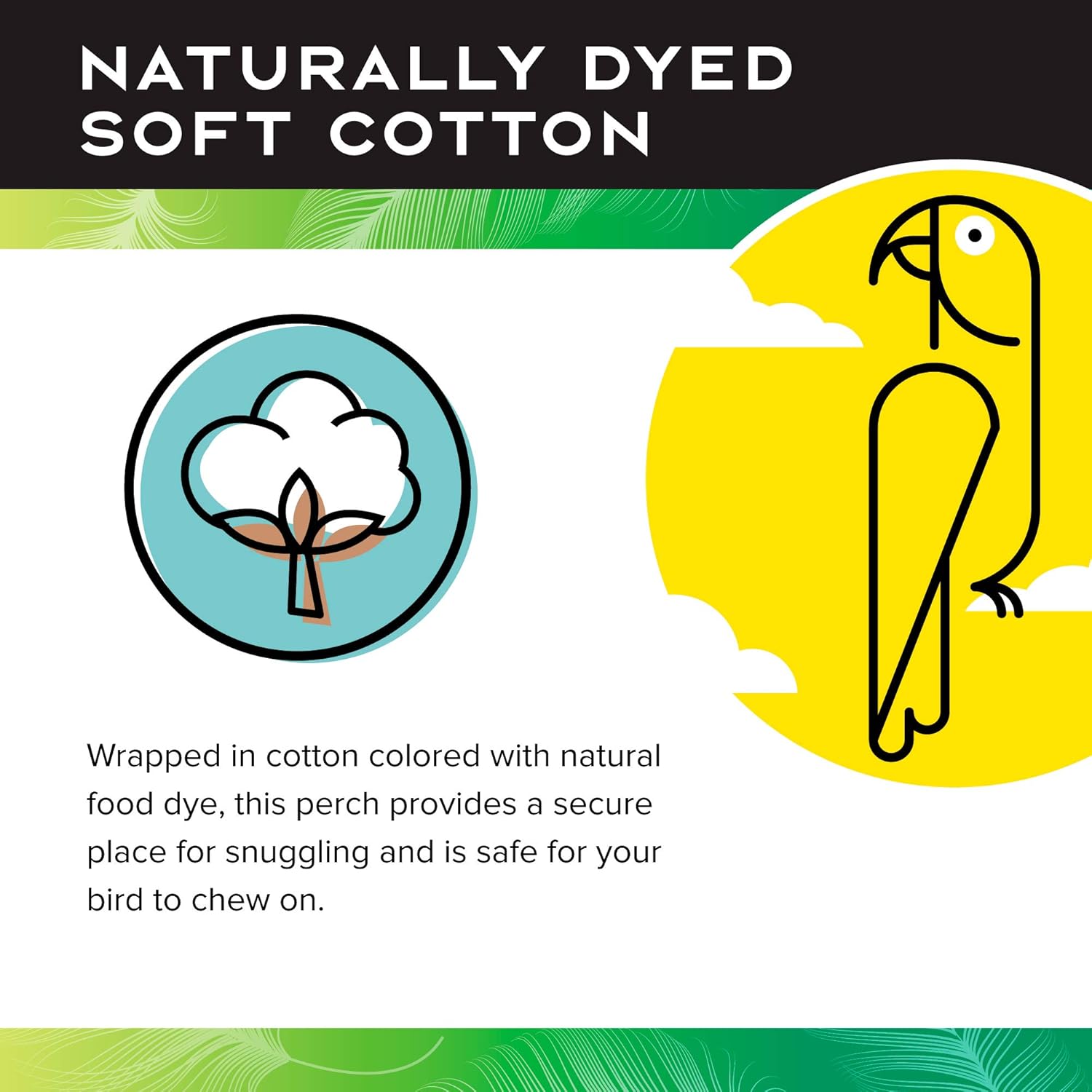 • NATURALLY DYED, SOFT COTTON: Wrapped in cotton and colored with natural food dye, these act as perches, rings, and small bird toys; Our soft cotton ring provides a secure place for snuggling and is safe for your bird to chew on