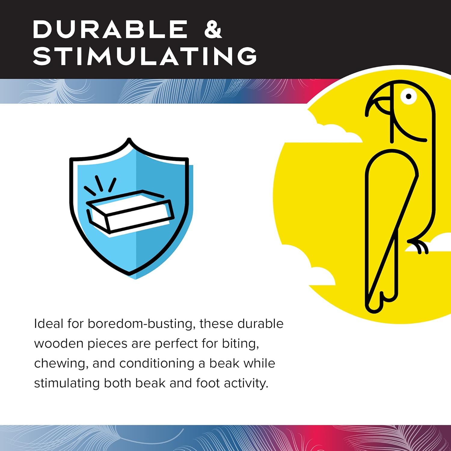 • VIBRANT: VIBRANT: This toy is comprised of brightly-colored wooden shapes hanging on multiple leather strings that will keep your feathered friend engaged for hours