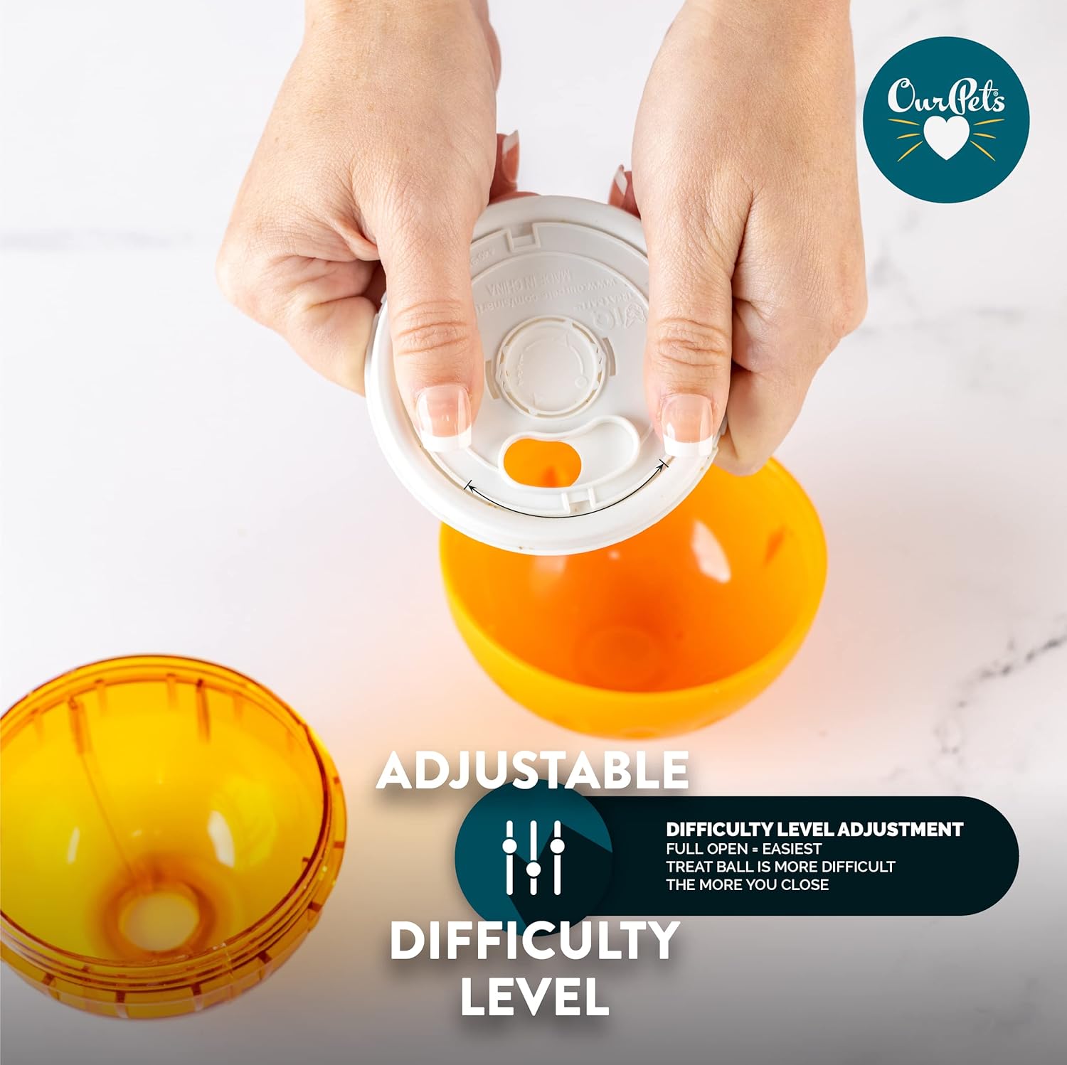 • CUSTOMIZABLE IQ TREAT BALL: Your furry friend gets smarter as they play with this interactive dog toy ball, learning how to roll the ball to get treats to fall out. Adjust the desired difficulty level using the ballโ€™s adjustable interior disc.