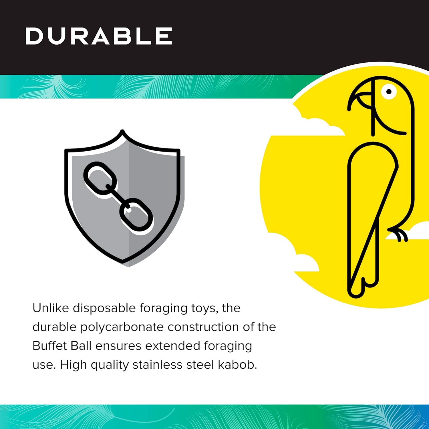 • DURABLE: Unlike disposable foraging bird toys, the durable polycarbonate construction of the Buffet Ball ensures extended foraging use; High quality stainless steel attachment is easy to install