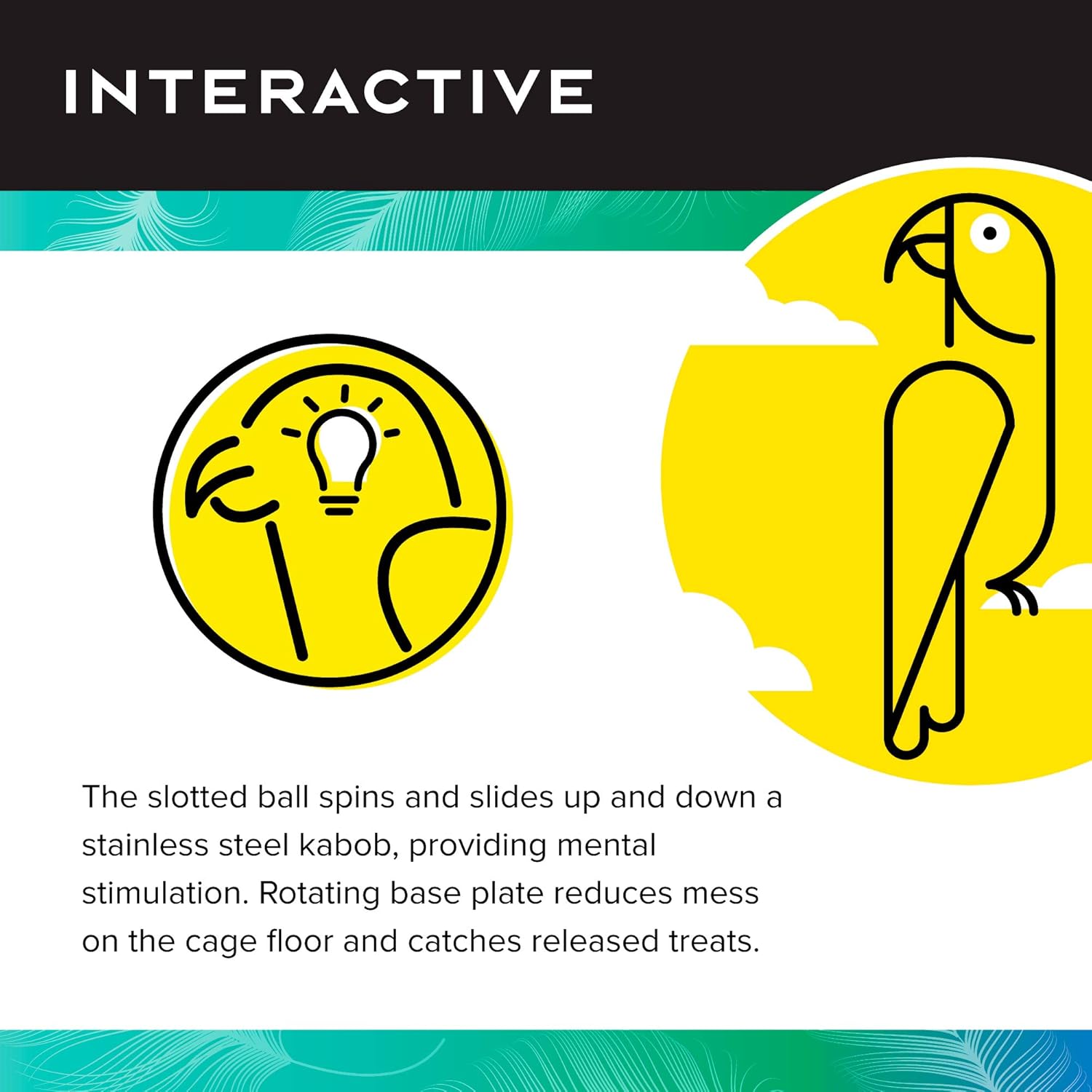 • FUNCTION: The slotted ball spins and slides up and down a stainless steel kabob, providing mental stimulation; Rotating base plate reduces mess on the cage floor and catches released bird treats
