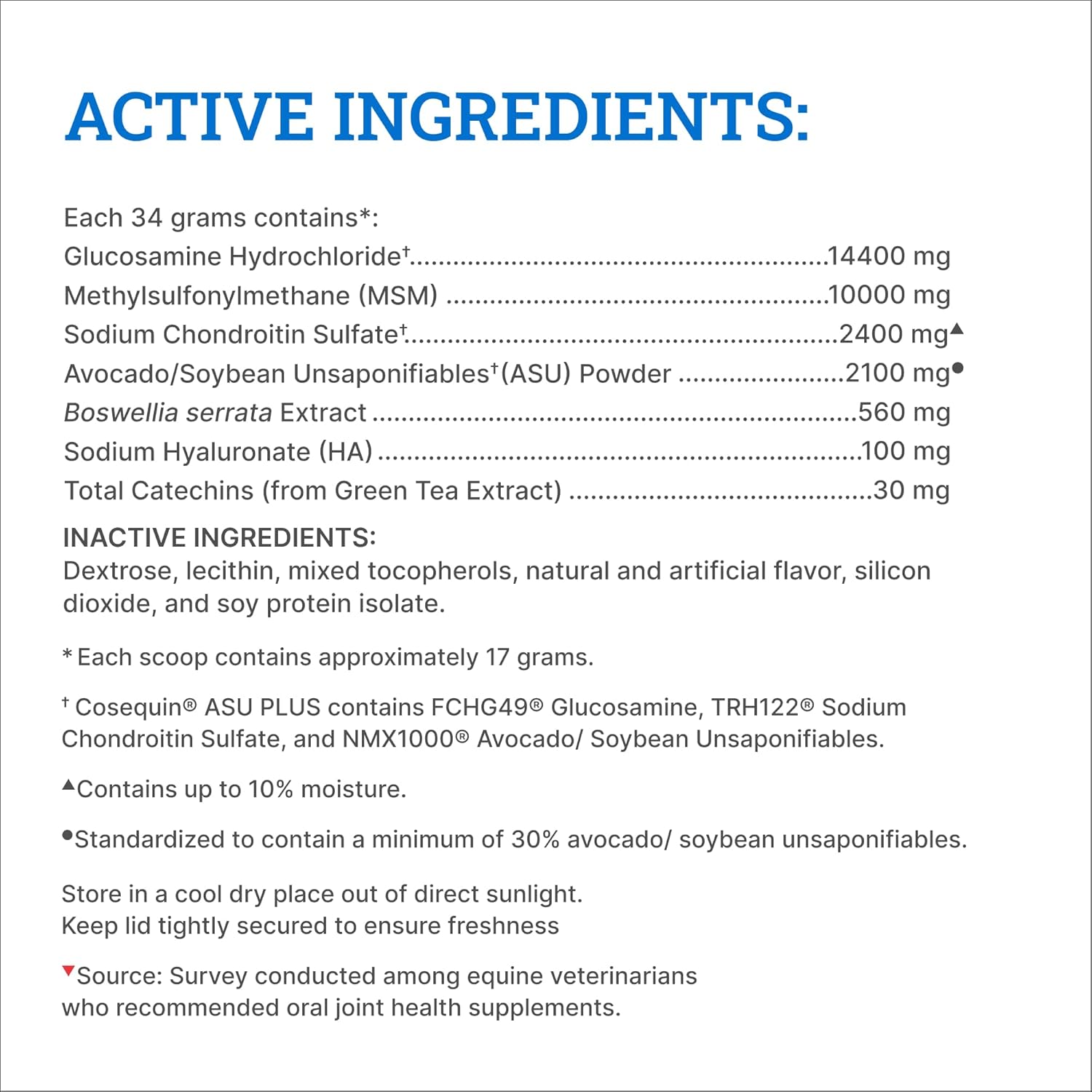 • Joint Health Support for Horses: Cosequin is the #1 veterinarian recommended joint health supplement brand*. This supplement is formulated with glucosamine, chondroitin sulfate, methylsulfonylmethane (MSM), avocado/soybean unsaponifiables (ASU), green tea extract and hyaluronic acid to support joint health