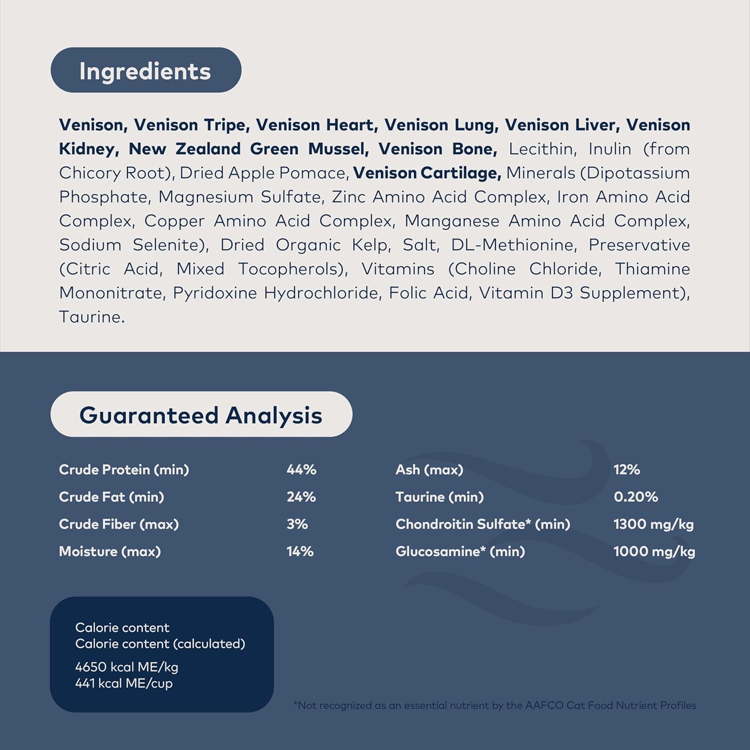• HIGH PROTEIN, NUTRIENT DENSE: Featuring 96% free-range Venison, Organs, Bone, and New Zealand Green Mussels, this grain-free cat food delivers nutrition with a mouth-watering taste for all cats. Gentle air dried processing retains the goodness of the raw ingredients. This food supports indoor cat food needs and is perfect for all life stages, from kitten food to senior cats.