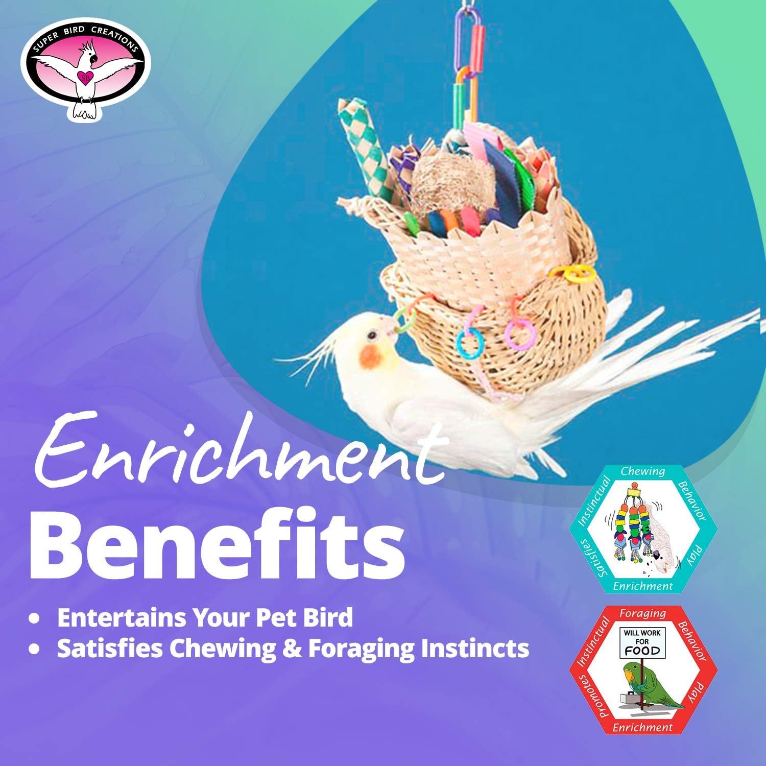 • BANISHES BOREDOM: Super Bird Creations parrot toys are "Playthings with a Purpose." They effectively combat boredom, depression, aggression, and destructive behaviors by stimulating physical activity, curiosity, and mental engagement in your feathered friend.