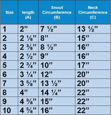 - PLEASE MEASURE BEFORE BUYING: Please refer to the product description or image section for an in-depth chart on how to size your dog. Measure from the tip of the nose to the slope below their eyes for snout length (Length A in Chart). Snout Circumference should be measured around the widest part of the snout with the dogโs mouth closed, just below the eyes (Snout B in Chart). The Neck circumference is measured around the neck right behind the ears (Neck C in Chart). If the circumference measurement fits one of the sizes in the chart, but the length of the snout is over the maximum range for that size, you should choose the next size for a better fit.