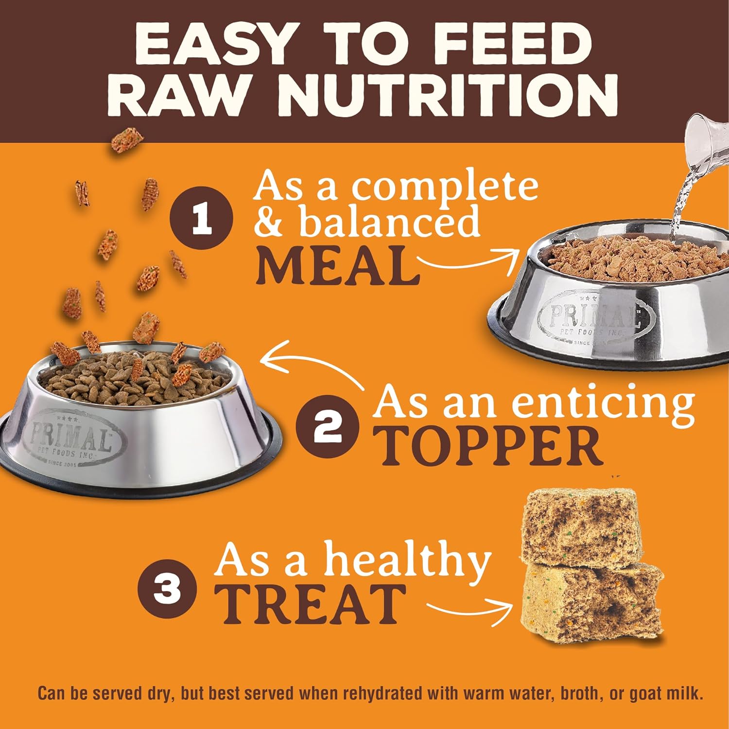• Serve as a complete & balanced meal, a freeze dried dog food topper or treat. Adding Primal Pet Food just a few times a week will help you start to see the results raw food for dogs can provide