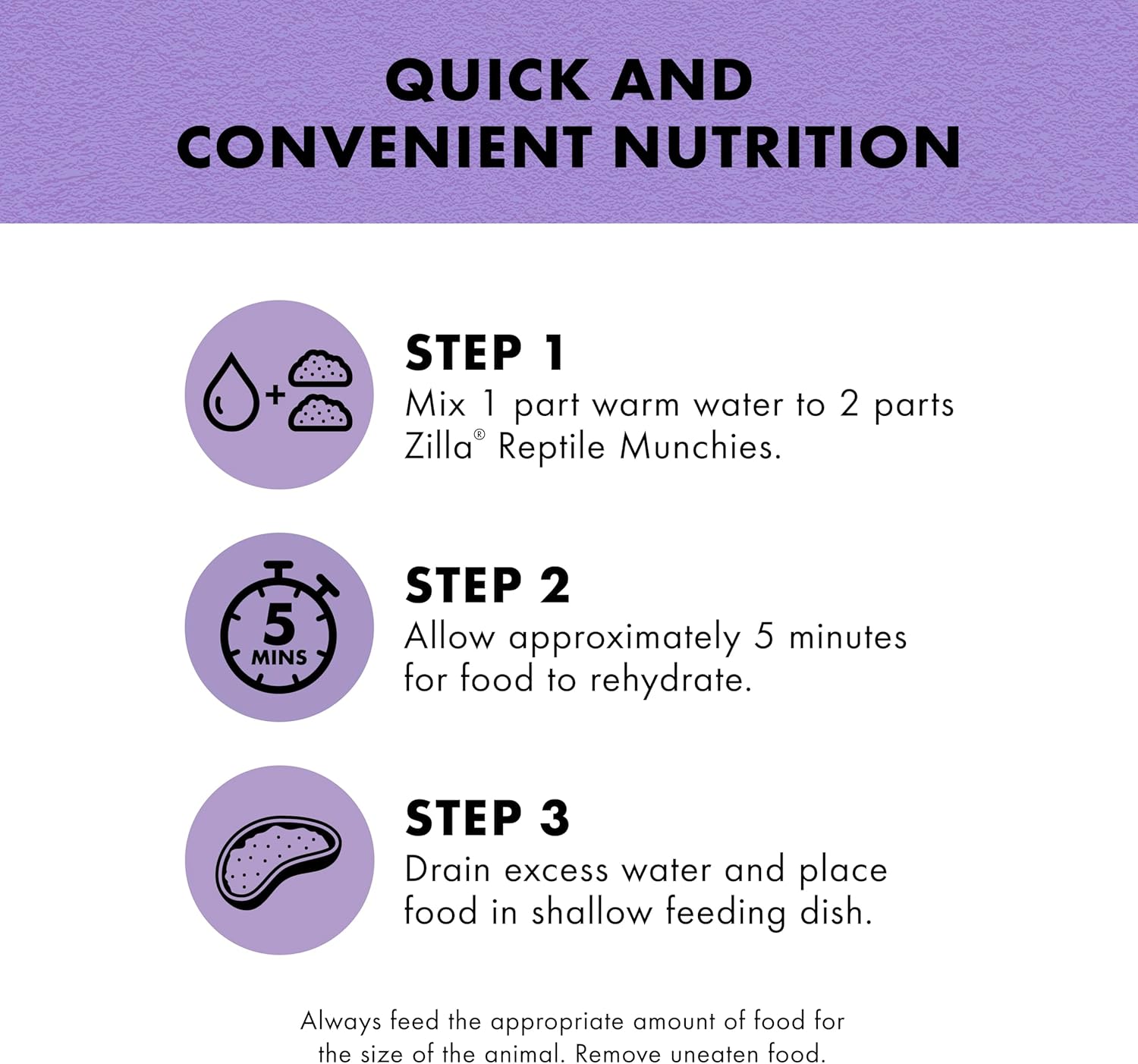 • TRY A VARIETY OF FLAVORS of Zilla Reptile Munchies. Available in Fruit Mix, Mealworm, Omnivore Mix, Vegetable and Fruit, Vegetable Mix and River Shrimp.