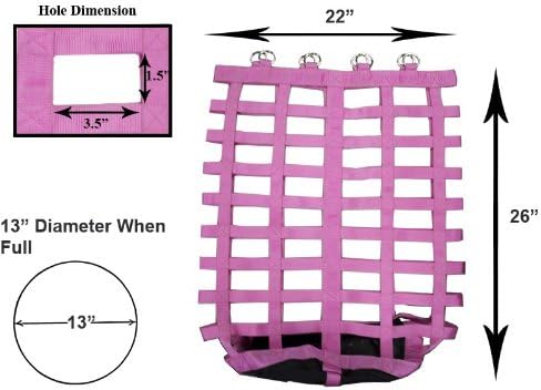 • HOLDS 2-3 FLAKES OF HAY - this 13x13x26" hay bag with 3.5x1.5" rectangular openings holds approx. 2-3 flakes of Timothy, Orchard, Alfalfa, or any other type of hay. Our hay bags were designed to minimize frustration and can be stuffed in seconds.