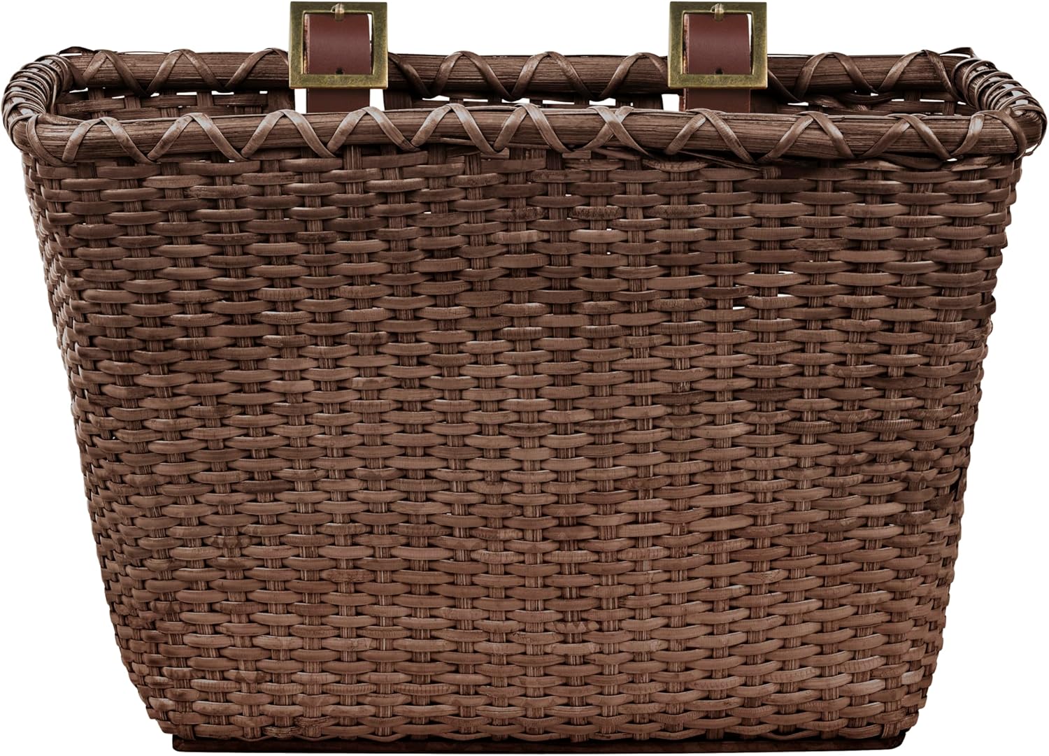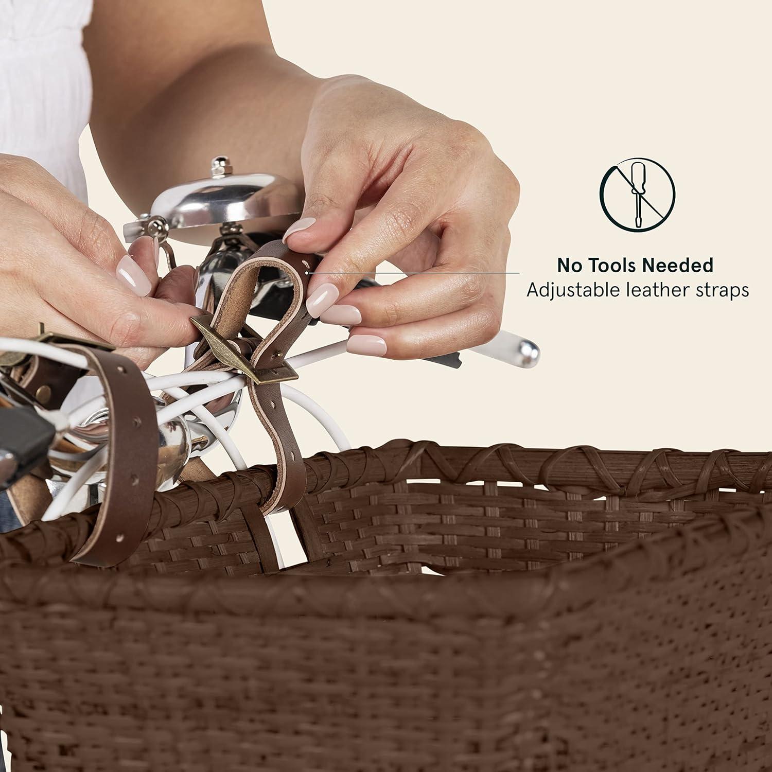 • Adjustable authentic leather straps with brass buckles attach basket to front handlebars without tools