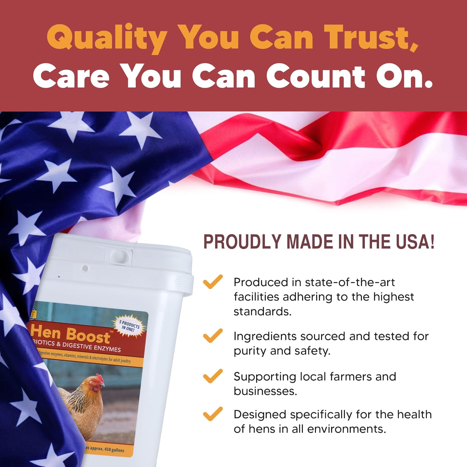 • Digestion Supplement - The benefits include immune system stimulation, improved feed intake, digestion and hydration. Providing access to Hen Boost in clean water during stressful times helps your birds recover and maintain their health with ease.
