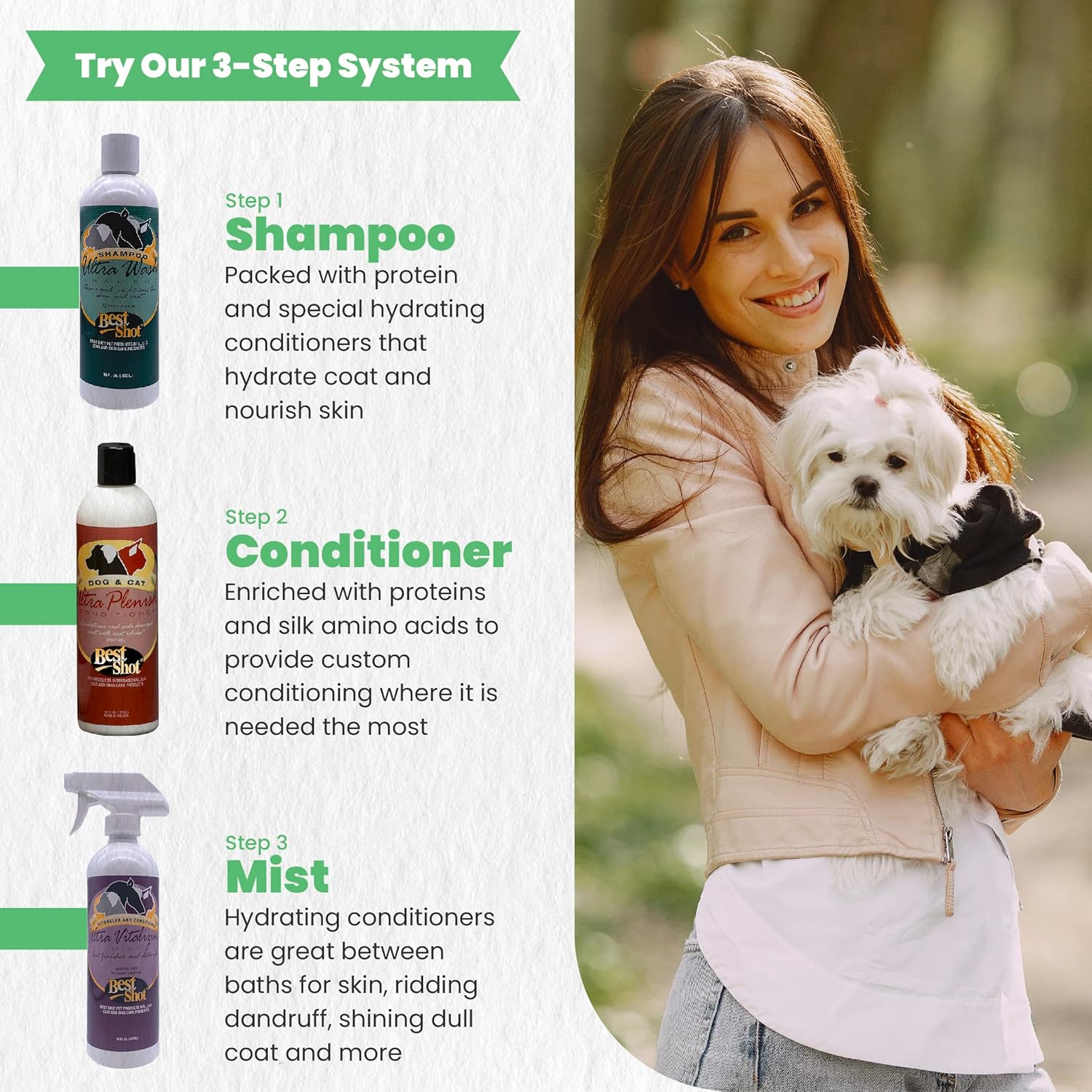 • Hypoallergenic: Alcohol-free and hypoallergenic, Best Shot’s Ultra-Vitalizing Mist detangling conditioner can be used for reducing malodor between baths, for routine brush-ups, or before drying to release more undercoat. Available in a 16 oz bottle