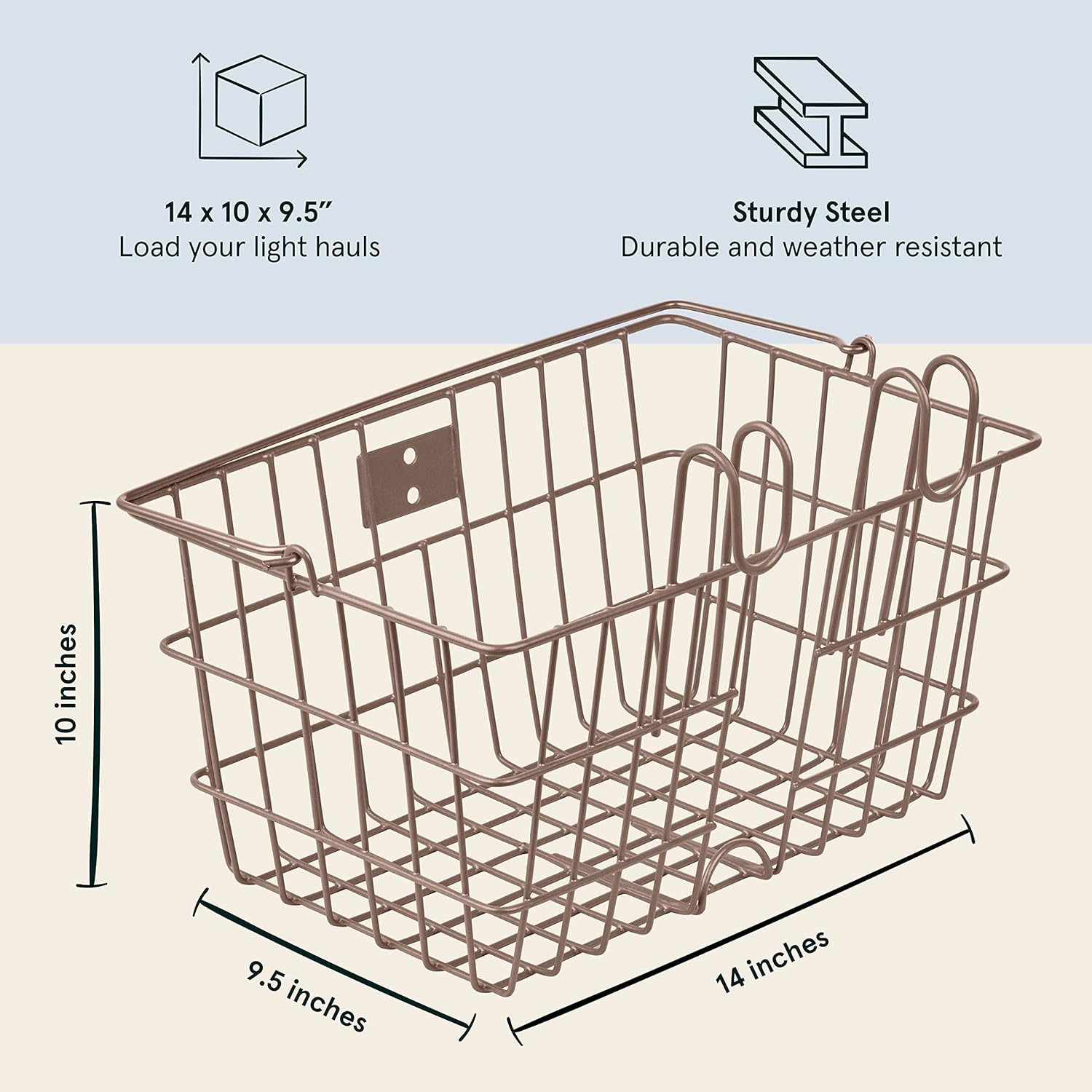 • Please note: while this basket fits most standard bicycles, we recommend taking measurements before completing your order. Basket Dimensions: 14.5" x 9.5" x 7.5"