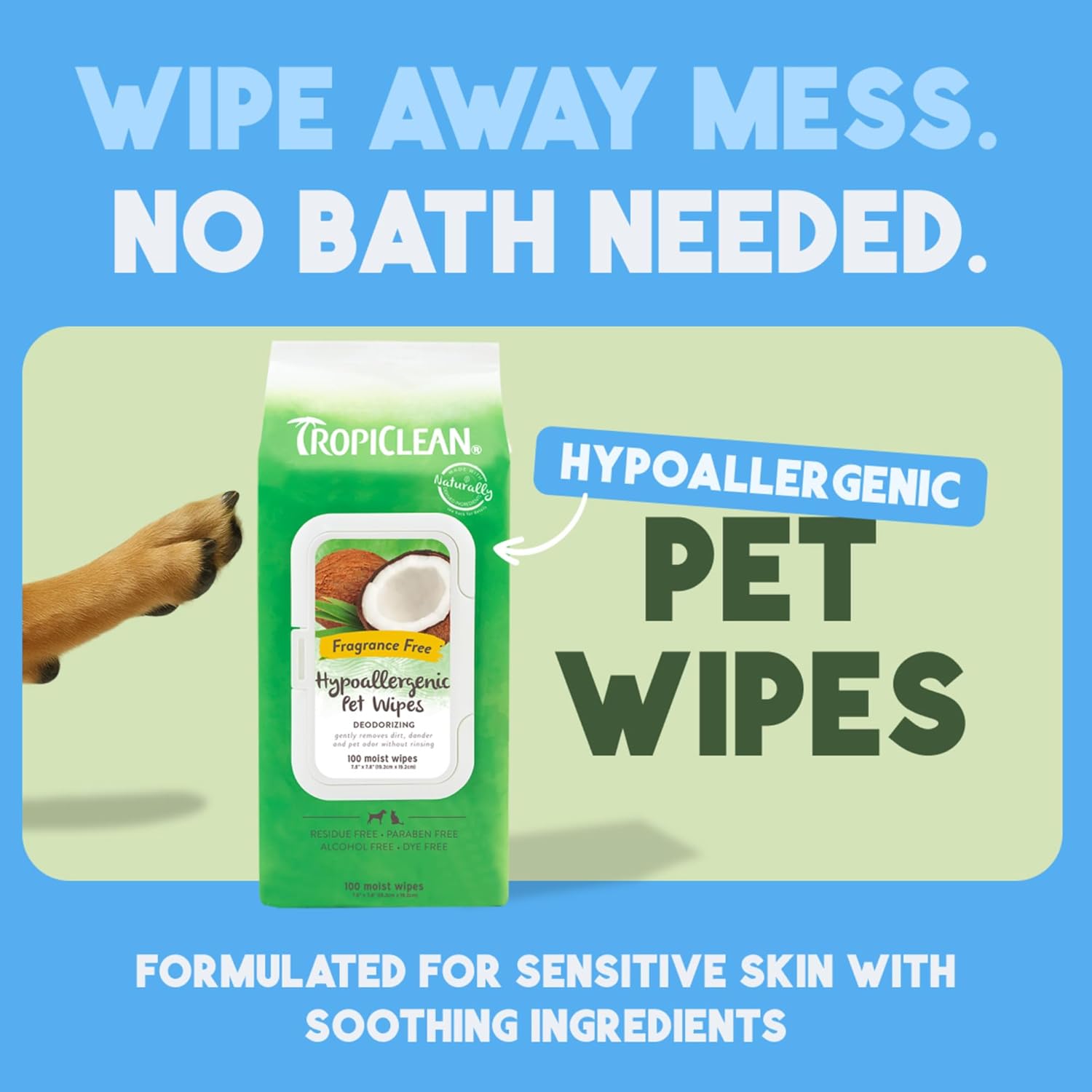 • On-the-go wipes - Fragrance-free TropiClean hypoallergenic pet wipes provide a quick and easy clean-up for the face, paws, body and bottom.