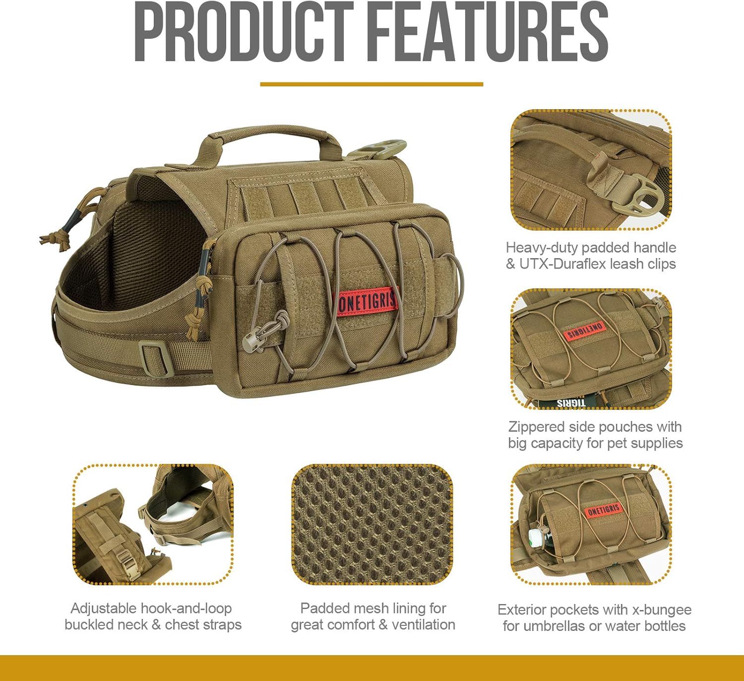 • OneTigris MAMMOTH Dog Pack: Durable 1000D nylon with mesh lining for breathability to maximize function and comfort on lengthier outings