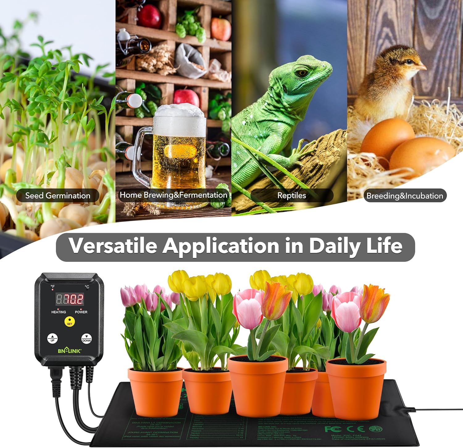 • ✓ VARIETY OF USES: Heat pad thermostat regulates and maintains temperature within a control range from 40–108 ºF. Perfectly compatible with reptile heating pad, seedling heat mat and heat lamp, Widely used in seedling germination, brewing, fermentation, greenhouse, breeding and more.