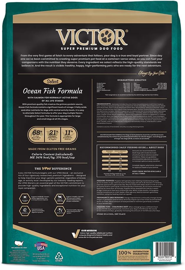 • HIGH QUALITY INGREDIENTS: VICTOR’s Select line of dog kibble offers specific proteins in a variety of formulated blends; Ocean Fish dog food features premium-quality fish meal as the primary source of protein, and is made with gluten-free grains, as well as salmon