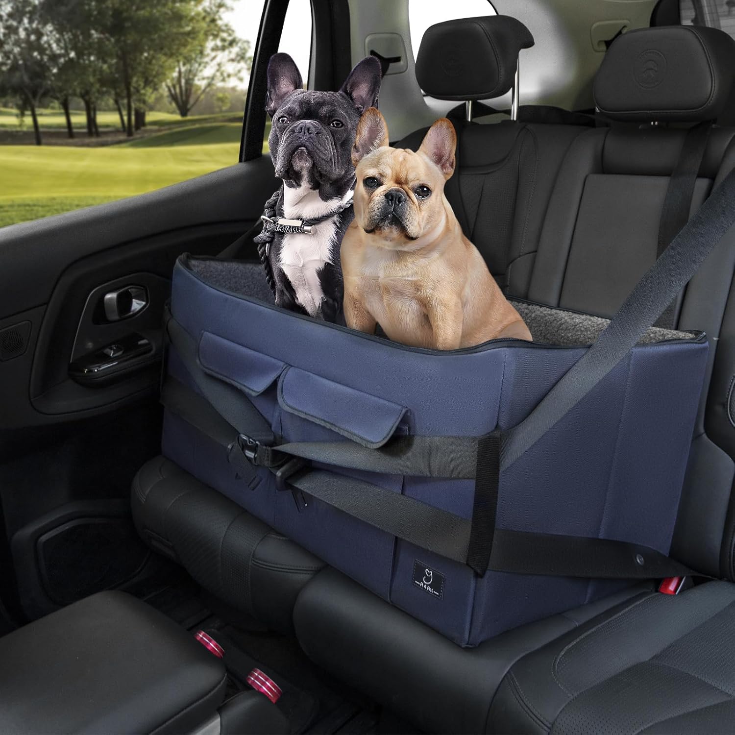 • Maximum Safety for Stress-Free Travel:Includes 2 adjustable safety leashes that buckle to headrests & seat belts, plus collar tethers to keep your dog secure. The non-slip base ensures stability in this large pet car seat.
