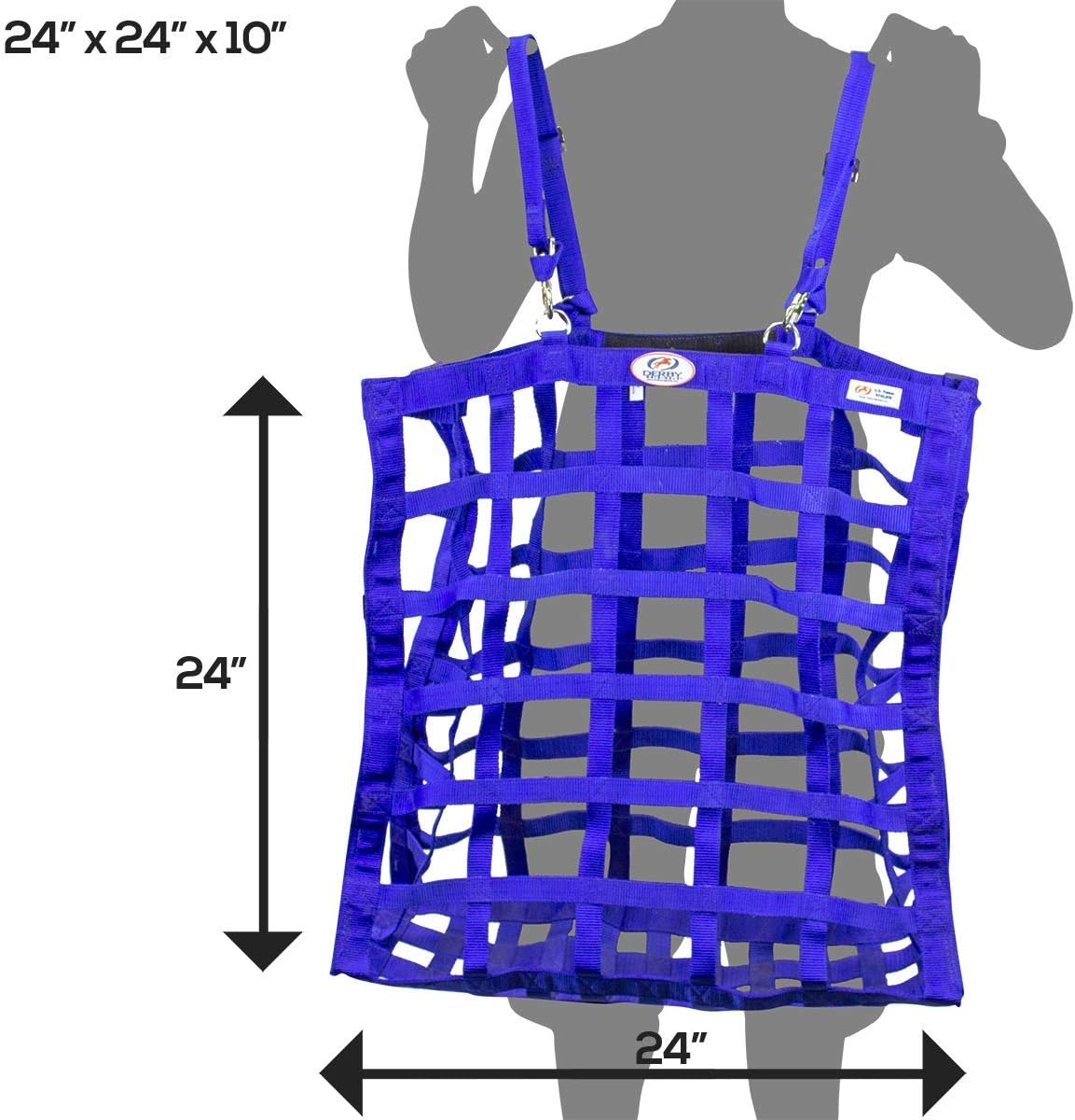 • HOLDS 2-3 FLAKES OF HAY - this 24x10x24" hay bag with 3.5x3โ€ rectangular openings holds approx. 2-3 flakes of Timothy, Orchard, Alfalfa, or any other type of hay. Our hay bags were designed to minimize frustration and can be stuffed in seconds.