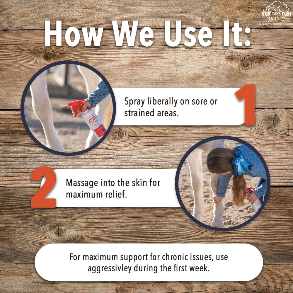 • Get Straight to the Ache: Natural Release Muscle Relaxant Spray works in minutes to help reduce equine muscle and joint stress, arthritis, tendonitis, discomfort, bruising. Can be used before or after physical exercise - we recommend both.