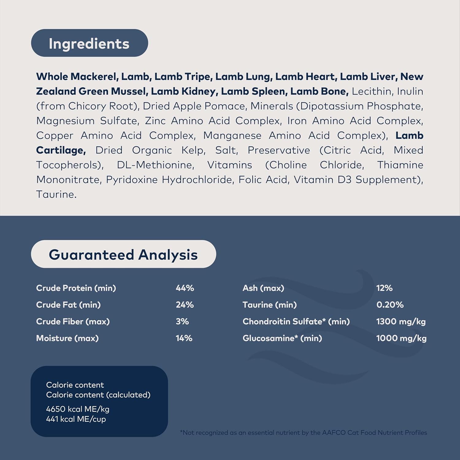 • HIGH PROTEIN, NUTRIENT DENSE: Featuring 96% wild-caught Mackerel, free-range Lamb, Organs, Bone, and New Zealand Green Mussels, this grain-free cat food delivers nutrition with a mouth-watering taste for all cats. Gentle air dried processing retains the goodness of the raw ingredients. This food supports indoor cat food needs and is perfect for all life stages, from kitten food to senior cats.