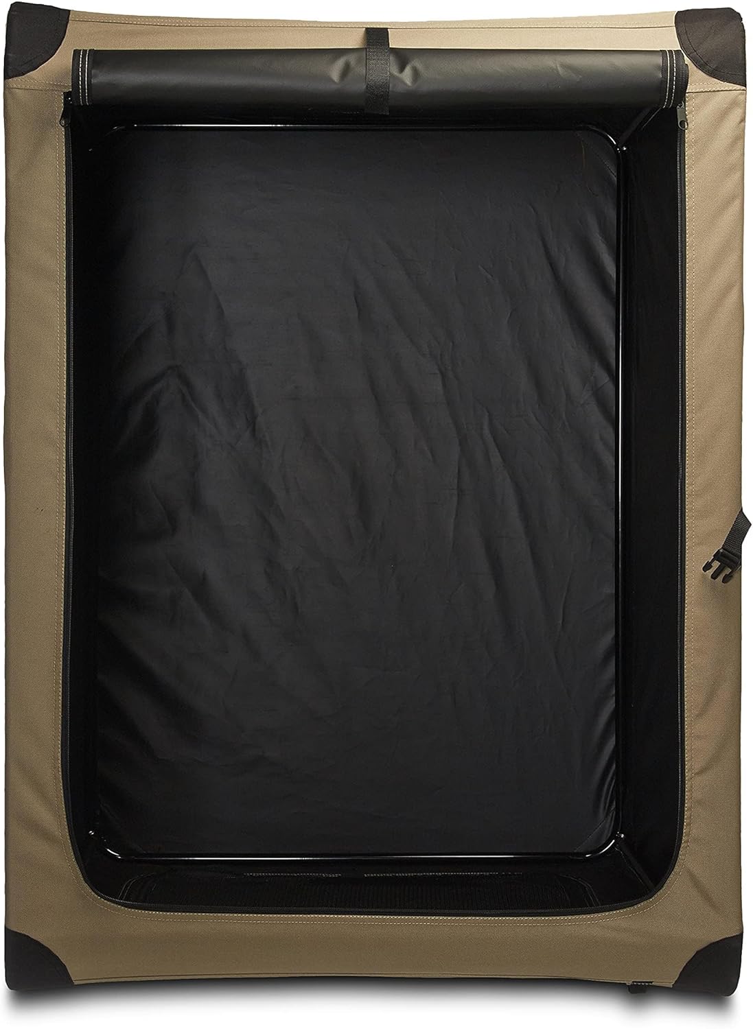• Includes an XL dog crate made of tan polyester fabric and a lightweight yet sturdy steel frame