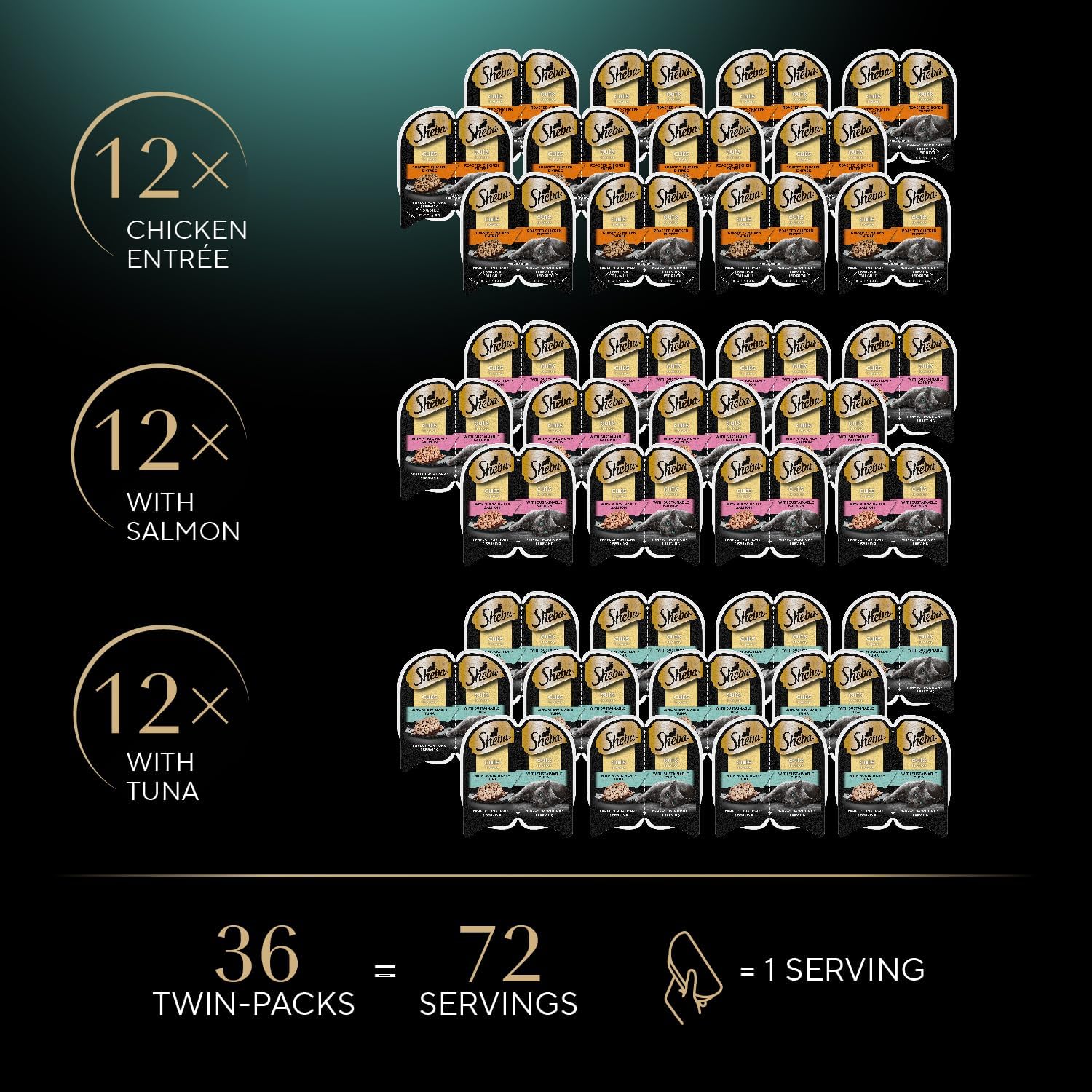 Sheba Perfect Portions Wet Cat Food Cuts in Gravy Variety Pack, Roasted Chicken Entree, with Sustainable Salmon, 2.6 oz. Twin-Pack Trays (18 Count, 36 Servings) (Pack of 2)