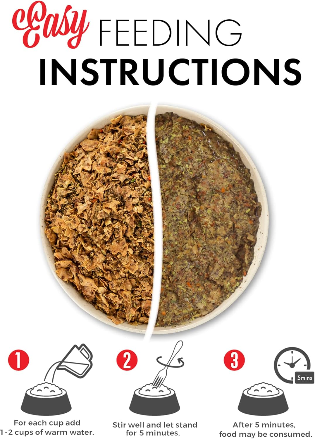 • JUST ADD WATER - For each cup of dog food add 1-2 cups of warm water. Stir well and let stand for 3-5 minutes