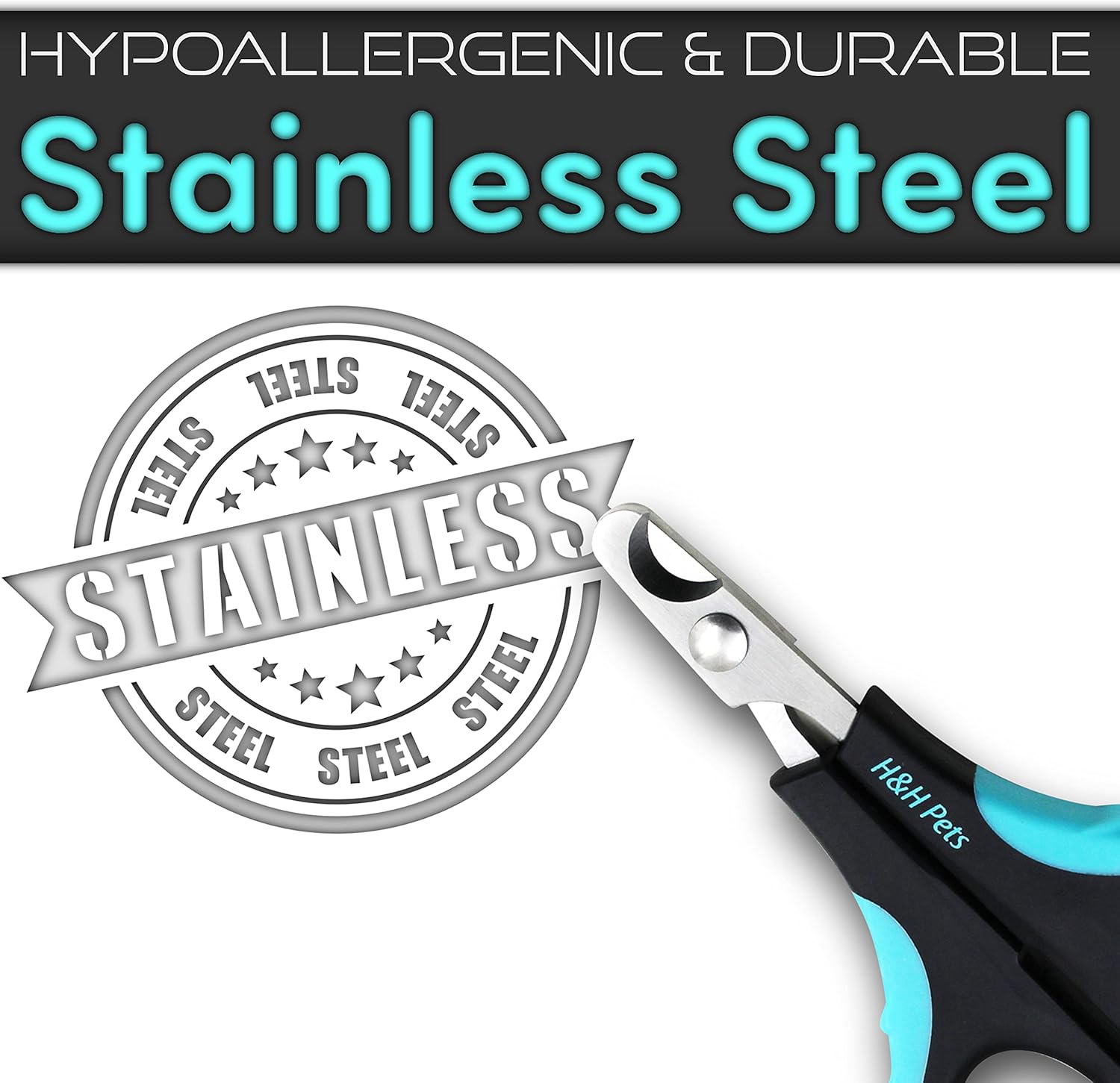 • HIGH QUALITY AND EASY TO USE DESIGN โ€“ The cat nail clipper's stainless steel blade is hypoallergenic and durable. The handle is finished with a slip-proof coating that allows you to securely and comfortably grip them in order to prevent painful accidents. Detailed instruction is printed on the back of the package.