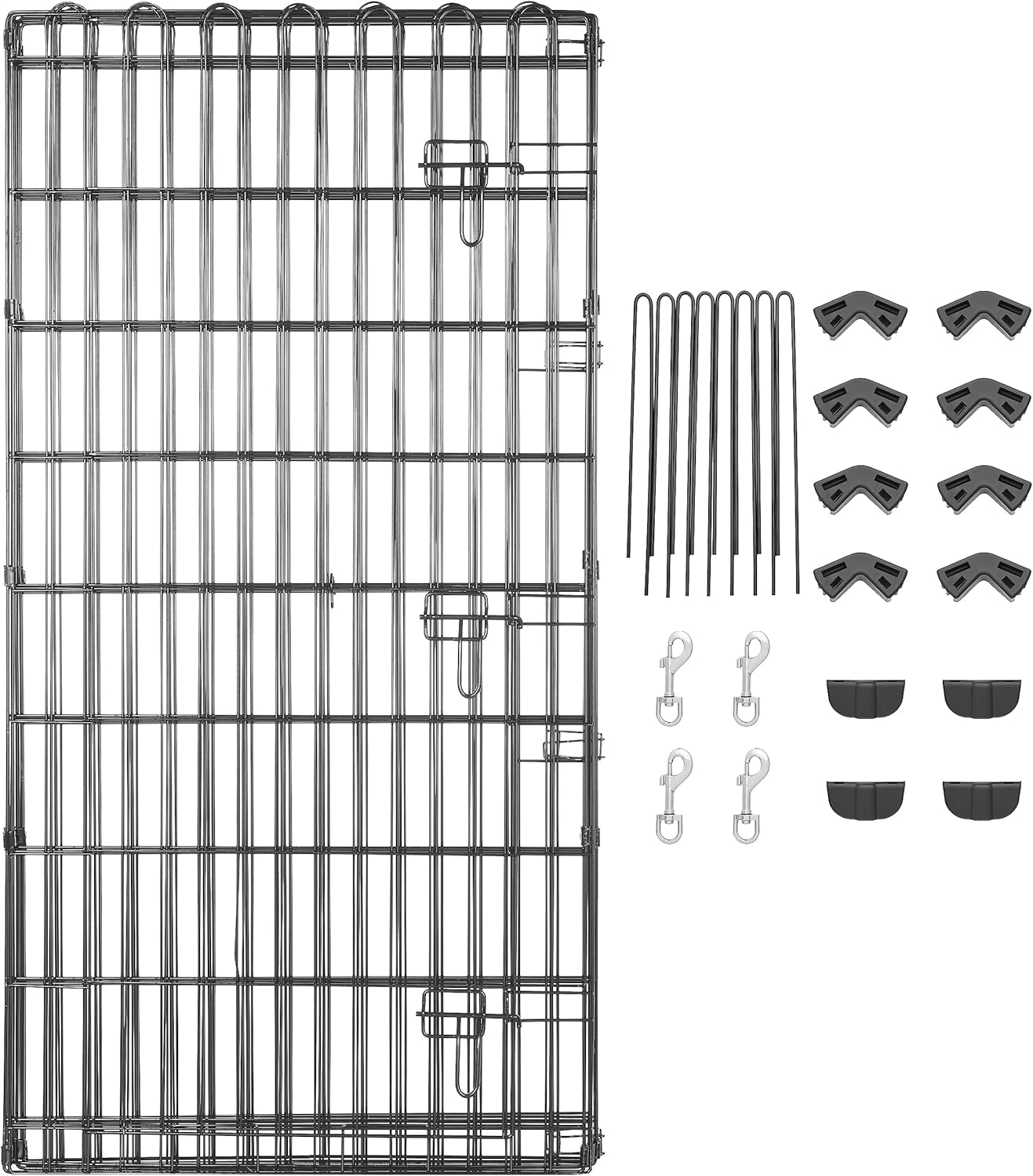 • 8 connected panels with thumb clips for connecting the ends together; 2 locking slide-bolt door latches; 8 ground anchors for secure placement outdoors; made of durable iron wire with a rustproof finish