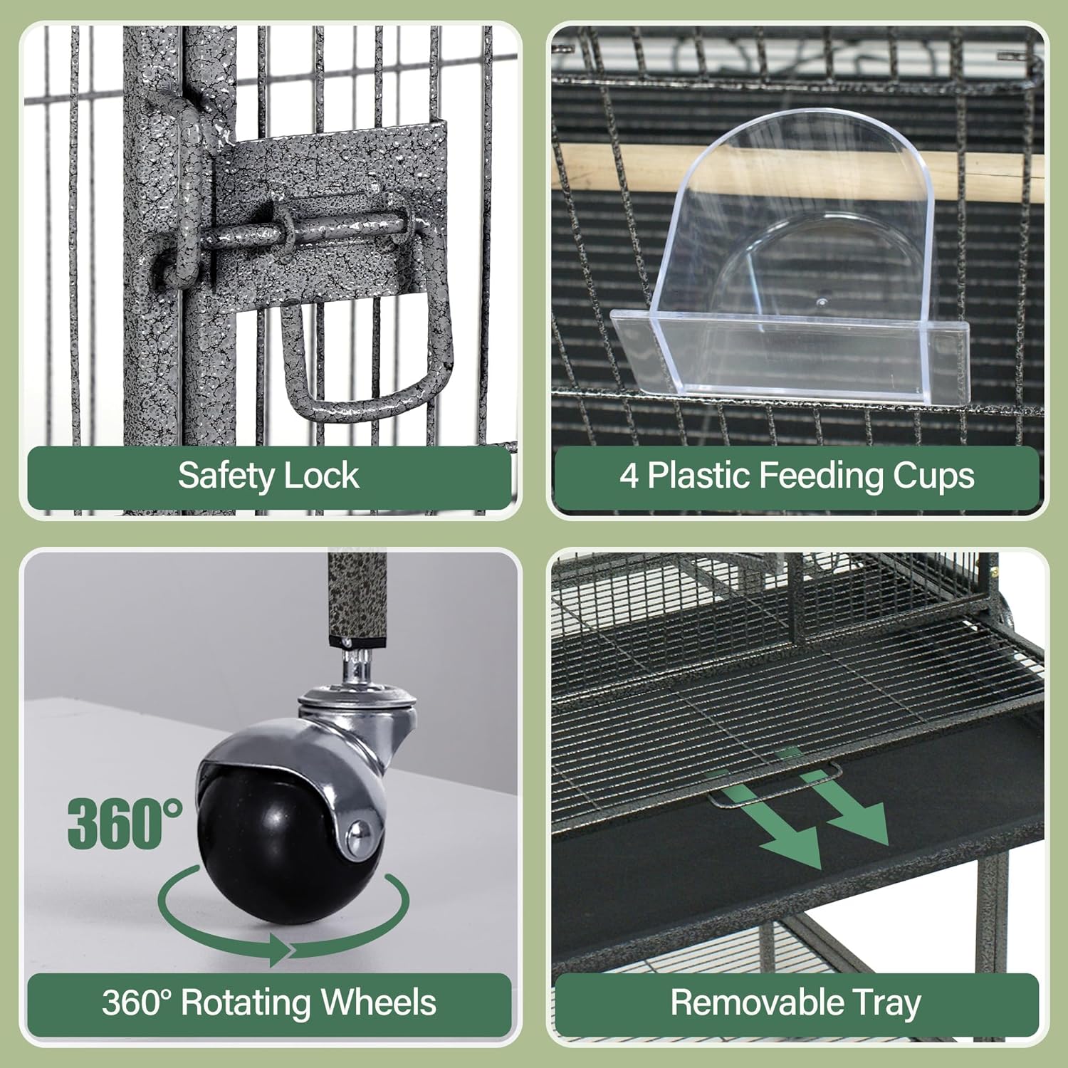 • 【Bird-Safe Construction】- This parrot cage is made of iron for durability and has a non-toxic, powder-coated finish. Four rolling casters make it easy to move around your home or take it outside for fresh air.