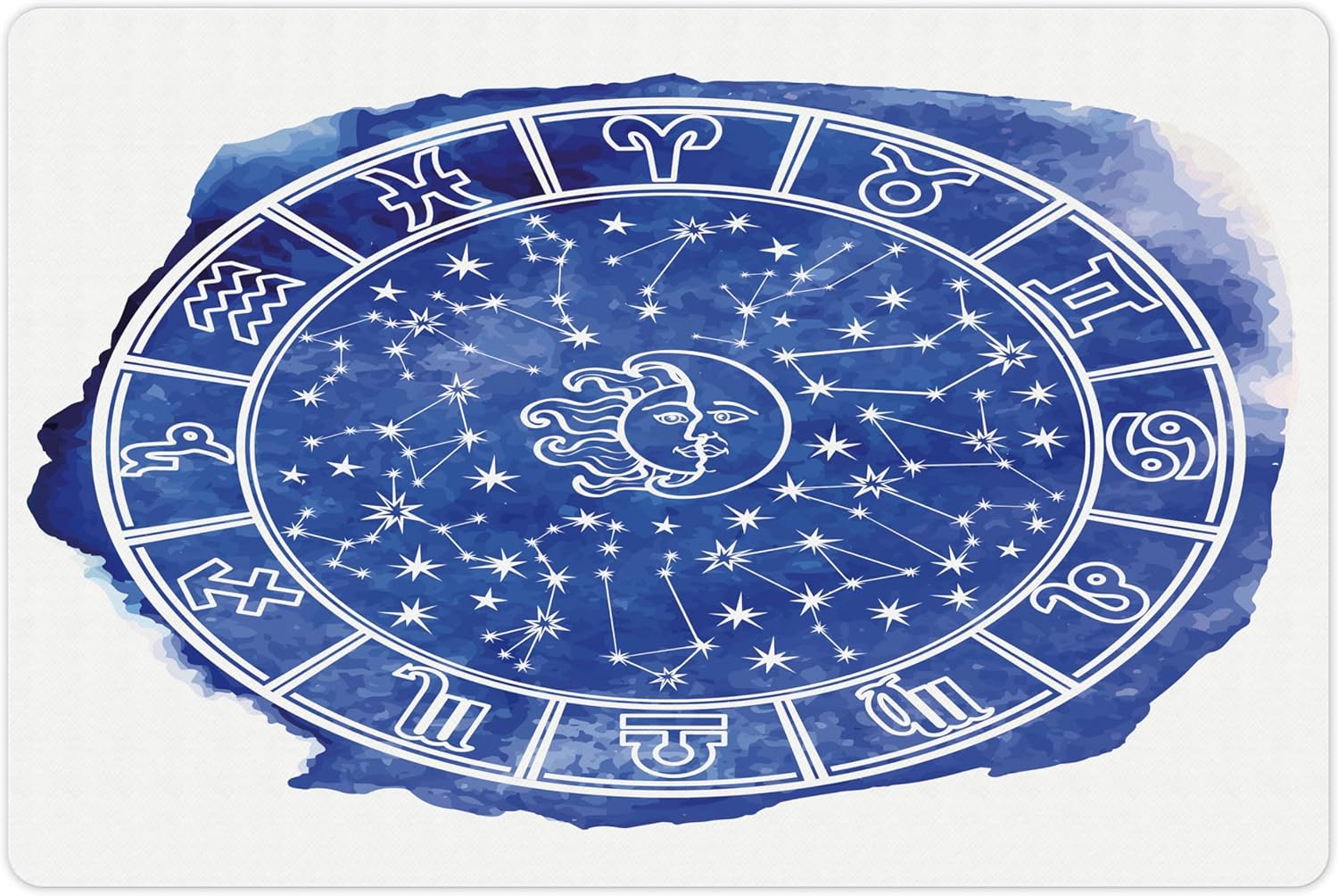 Lunarable Sun and Moon Pet Mat for Food and Water, Zodiac Circle Watercolor Backdrop Astrology Divination Fantasy Mystic, Non-Slip Rubber Mat for Dogs and Cats, 18" X 12", Blue White