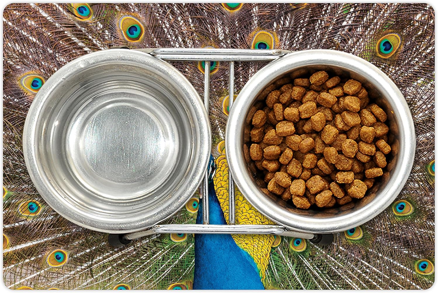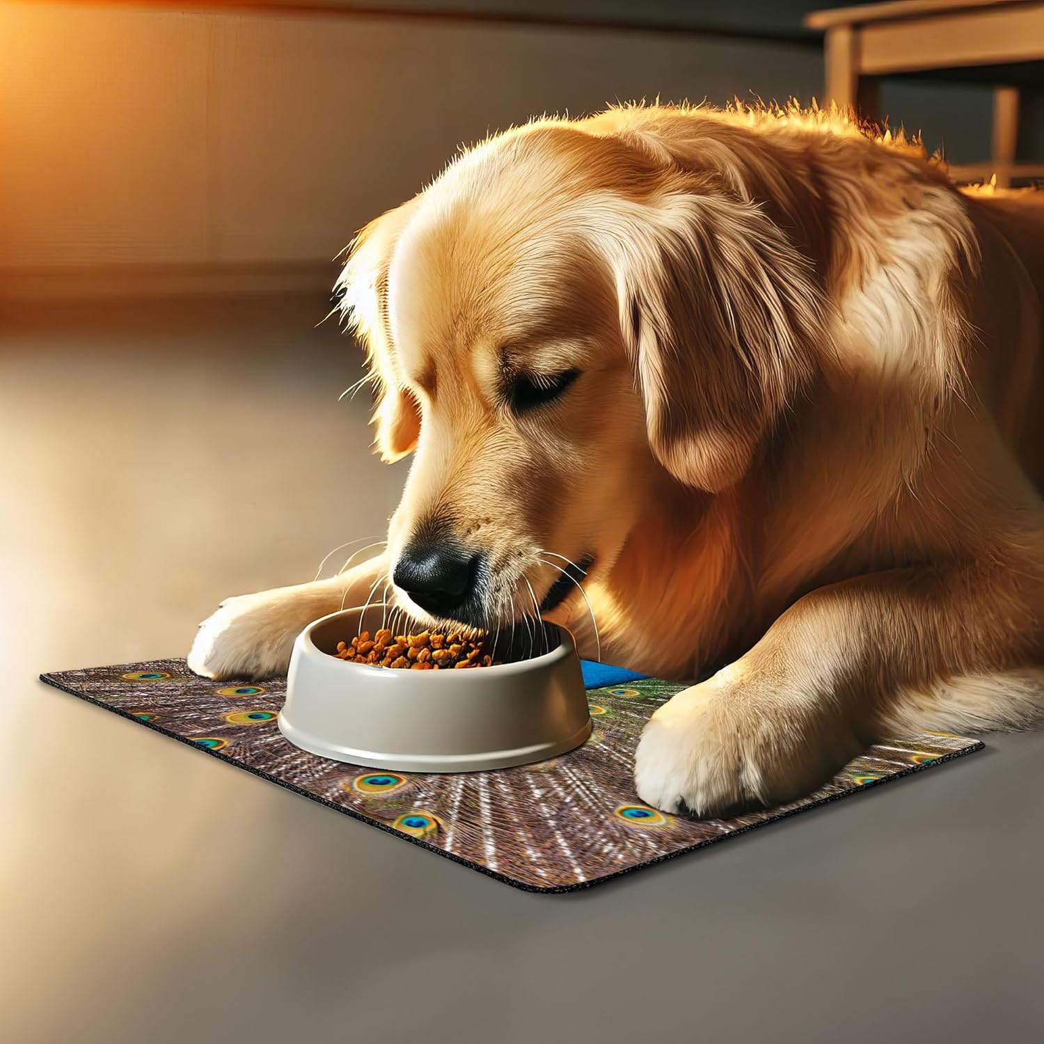 Lunarable Peacock Pet Mat for Food and Water, Peacock Displaying Feathers Vibrant Colors Eye Shaped Patterns Picture, Non-Slip Rubber Mat for Dogs and Cats, 18" X 12", Mustard Brown