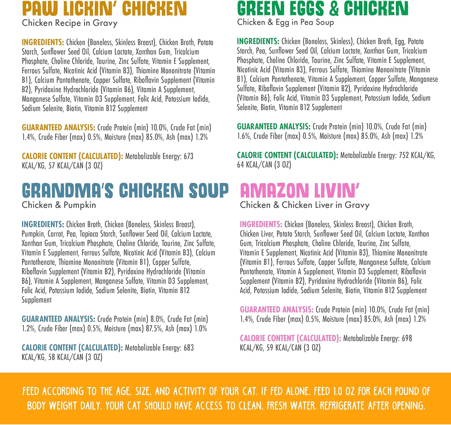 • Variety Pack includes 6 cans of each: Paw Lickin’ Chicken, Green Eggs & Chicken, Grandma’s Chicken Soup and Nine Liver.