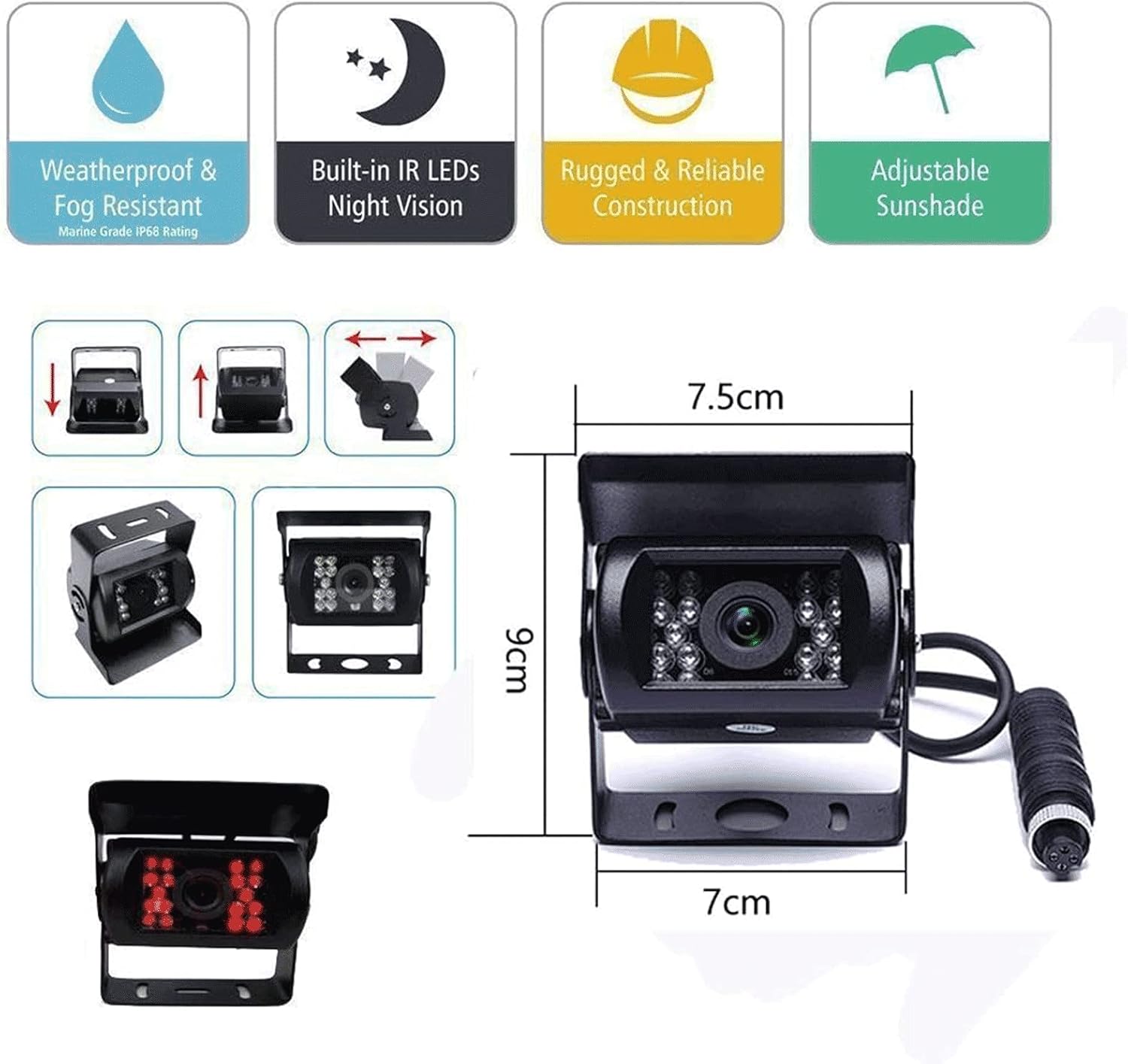 • ใ€IP68 Waterproof RV Backup Camera (No Guide Lines)ใ€‘Hard Metal Cased Camera, waterproof and Mud proof. 18 IR LEDs for Night Vision + 120ยฐ horizontal wide view angle + 180ยฐvertical adjustable angle to view the blind spots. You can get it work Full Time when connect to constant power source
