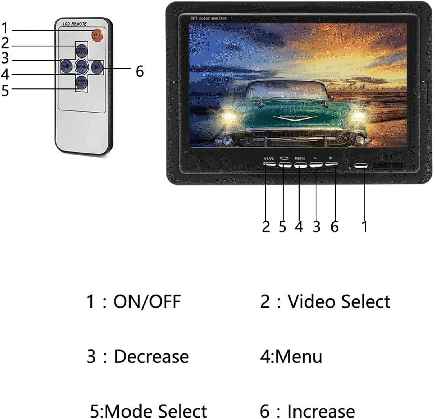 • ใ€7-inch Screen Car Rear view Monitorใ€‘2-channel video input, high resolution image, full color display and low power consumption, adjustable brightness, contrast and color. Image can be rotated horizontally and vertically for mirror or normal viewing