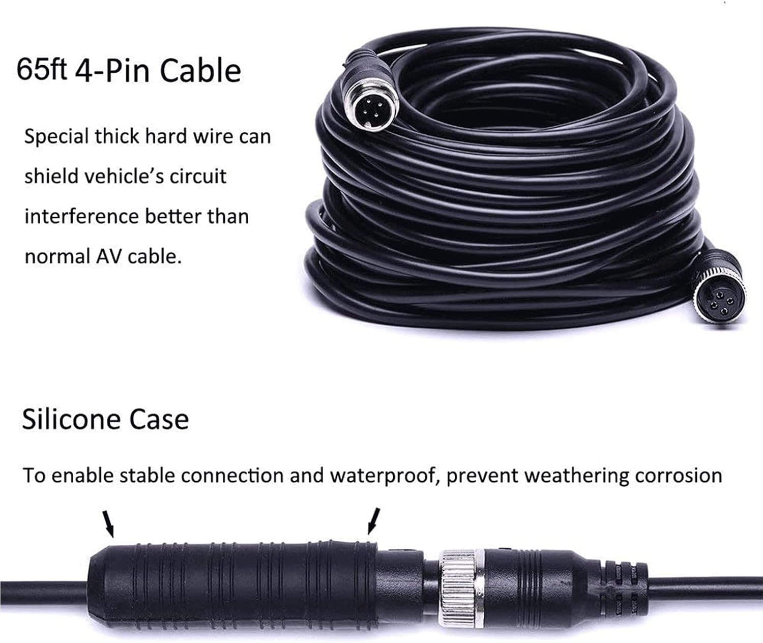 • ใ€Backup Camera Kit With Extended Aviation 4 Pins Connector Cordใ€‘Strong anti-interference, more close connection, easy to install. Special thick hardwire can shield vehicleโ€™s circuit interference better than normal AV cable