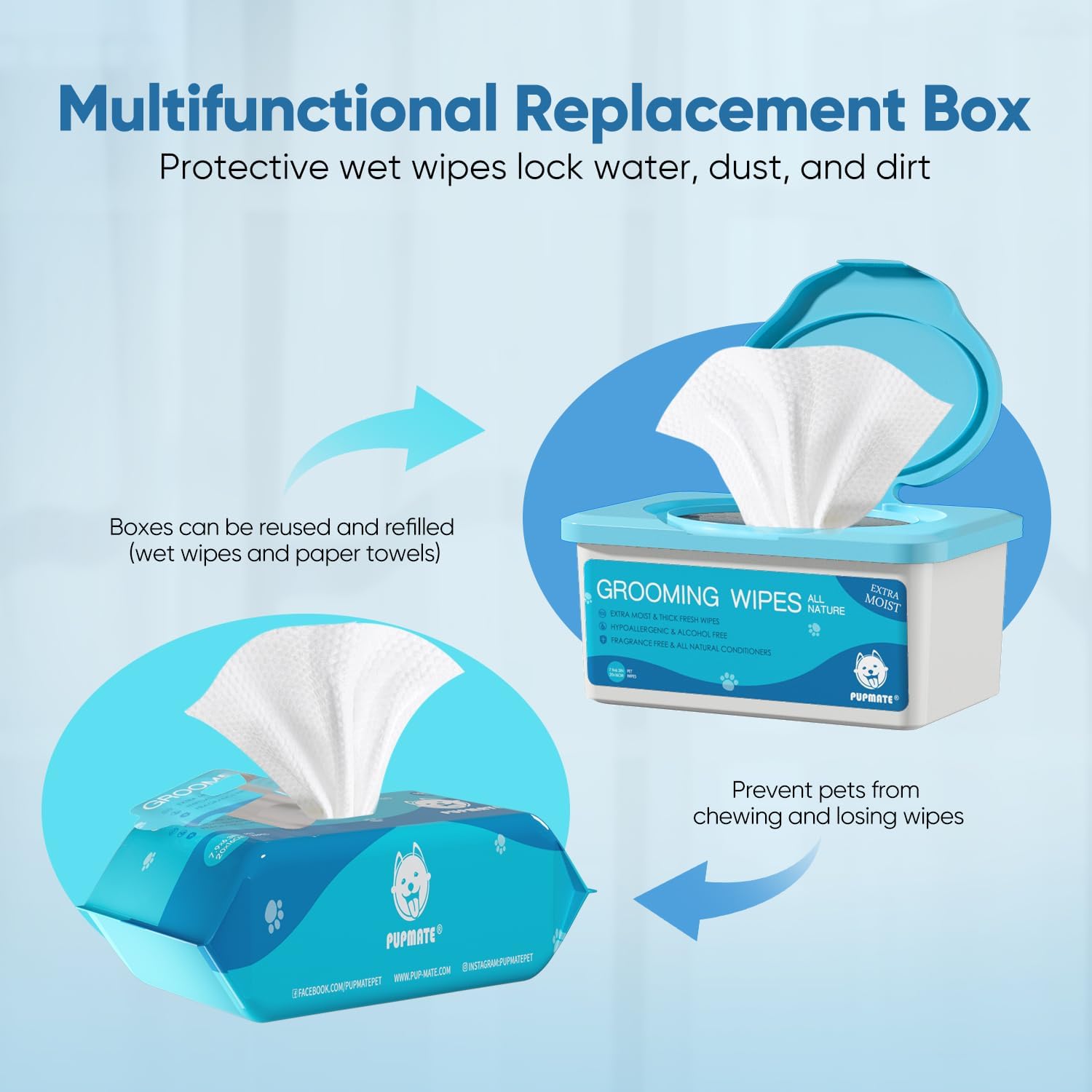 • DELICATE AND EFFICIENT CLEANSING: At PUPMATE, These grooming wipes for dogs & cats, and puppies wipes go beyond cleaning โ€“ they embody our commitment to creating a happier, healthier life for pets. Whether it's ridding them of dirt, mud, or a weird smell, our pet wipes work diligently to cleanse their butt, eyes, ears, and paws, ensuring that their four-legged friend feels consistently clean and delightfully refreshed