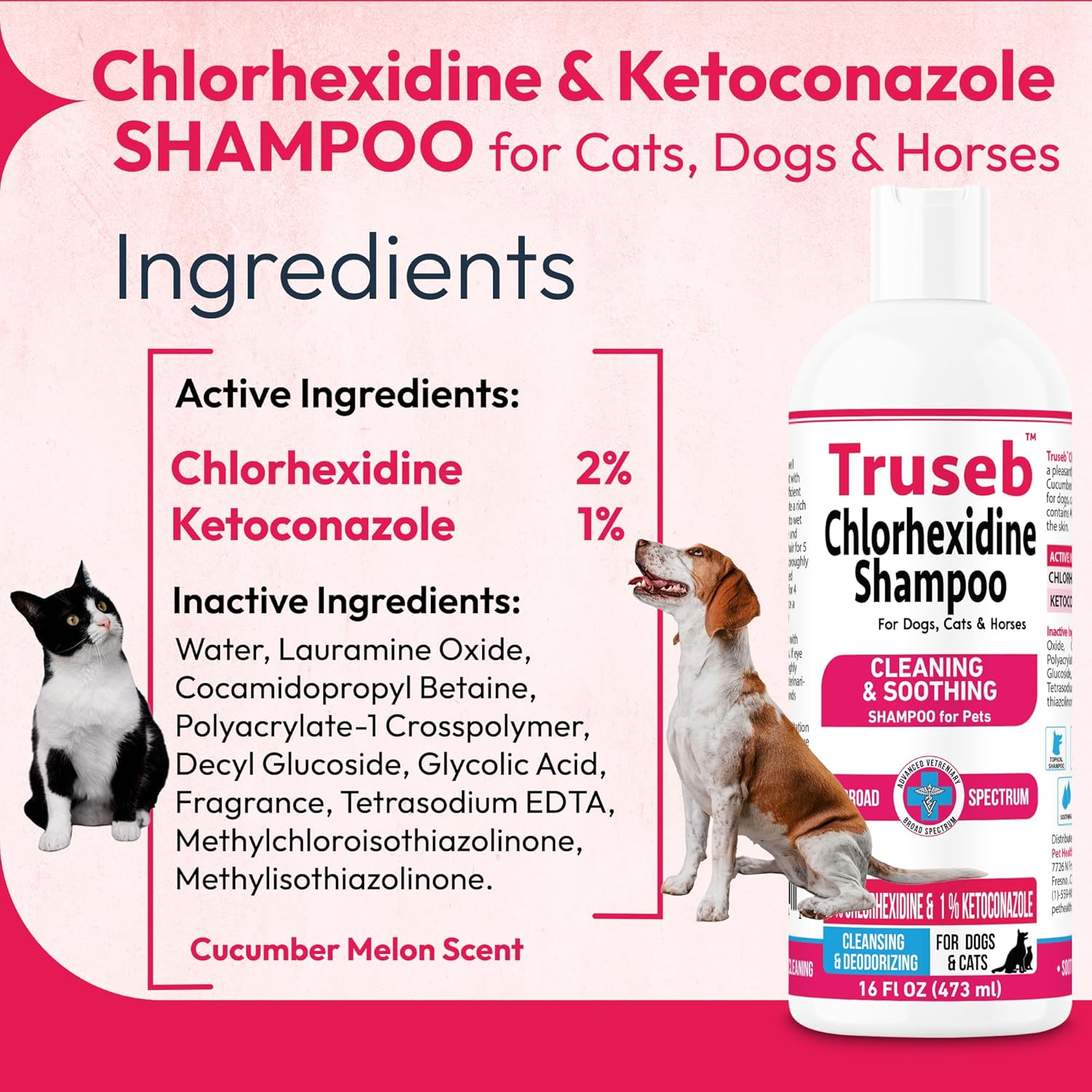 • Shampoo That’s Effectively Helps Skin Issues - Truseb Chlorhexidine Shampoo is made with Chlorhexidine and Ketoconazole for the safest and most effective way to helps your dog or cat's skin issues right in your own home. The shampoo is has a light cucumber melon scent to help combat smelly skin issues. Our advanced formula deodorizes the fur, helps remove knots from fur, and makes it nice while soothing their skin and providing purifying and hydrating properties.