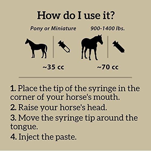 • HOW TO USE? - Place the tip of the syringe in the corner of your horseโ€™s mouth. Raise your horseโ€™s head. Move the syringe tip around the tongue. Inject the paste