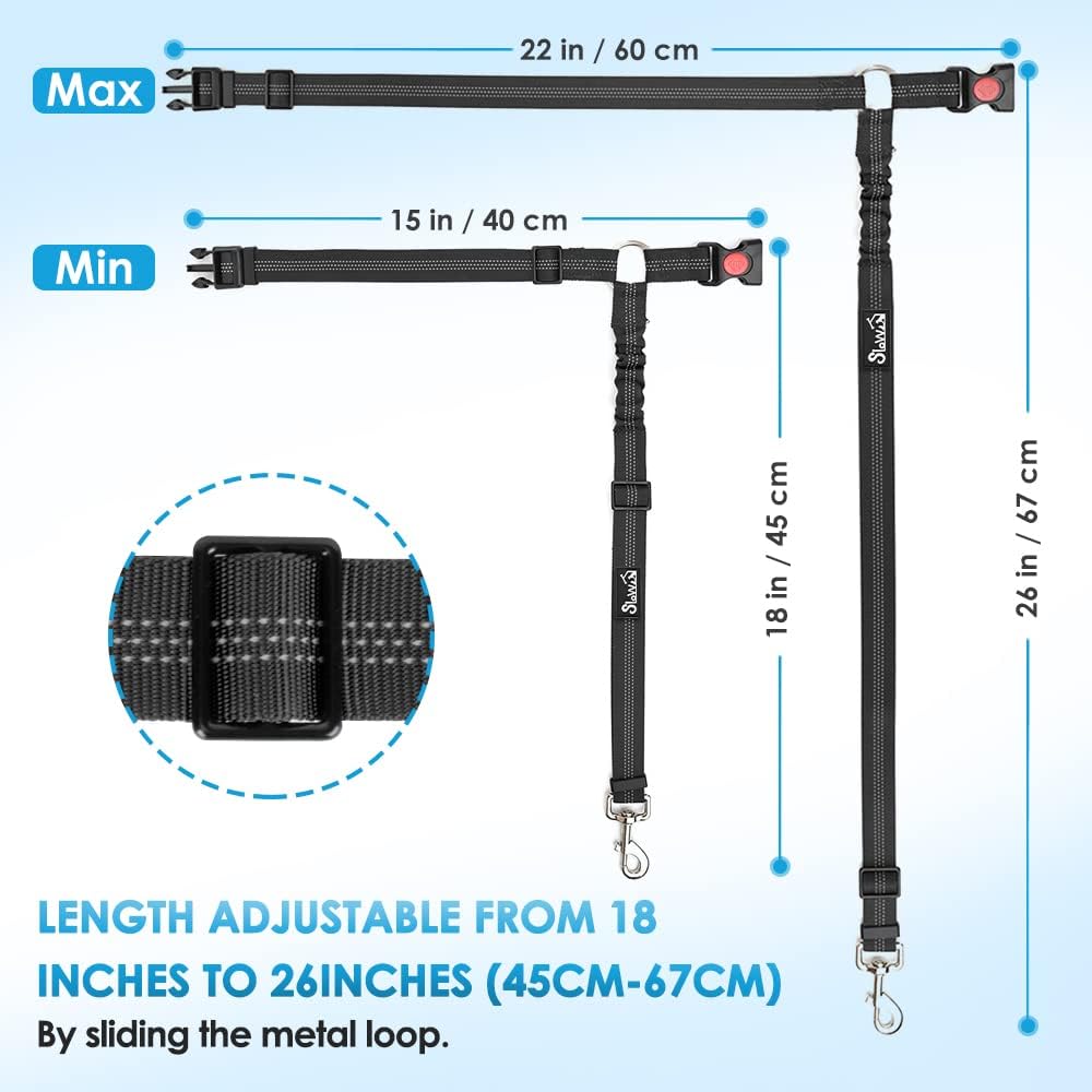 • Adjustable Seatbelts --- With a buckle and the elastic bungee inside, the seat belt can be adjusted from 20 inches to 27 inches and stretched to a maximum length of 32 inches. The circle can be adjusted from 16 inches to 24 inches. An adjustable car seat belt harness allows the dog to get comfortable without limiting himself.