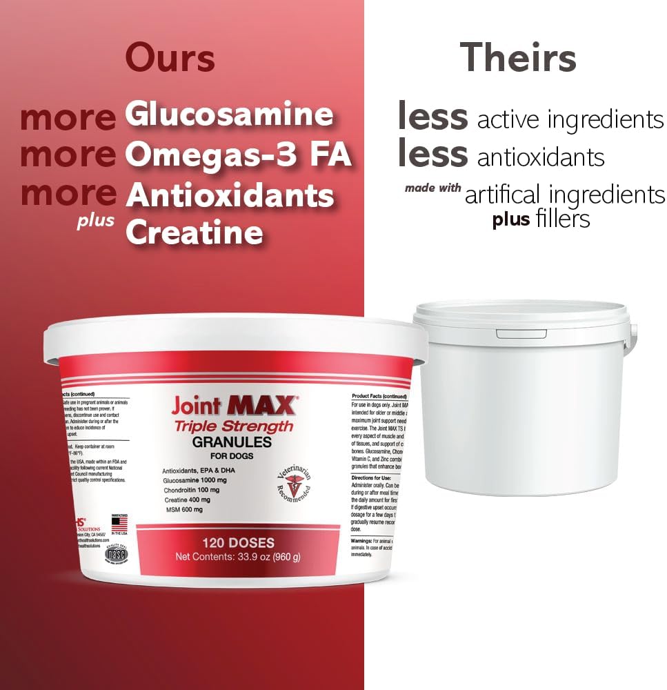 • RELIEF FROM INFLAMMATION - For active dogs or once active dogs that still love to play, Joint MAX Triple Strength uses natural turmeric root to reduce inflammation and relieve joint pain. Your pet will finally rest comfortably after a rough day at the dog park with our super joint enhancer.