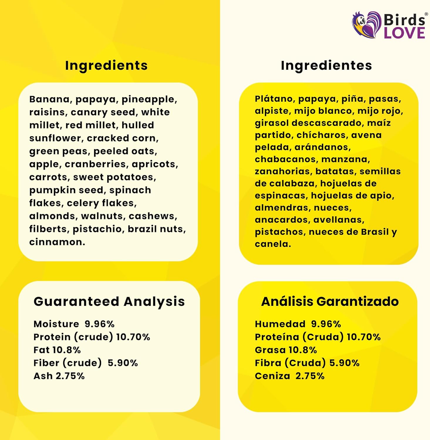 • No added preservatives nor sweeteners: natural sweet fruits to maintain healthy skin, muscles, and feathers