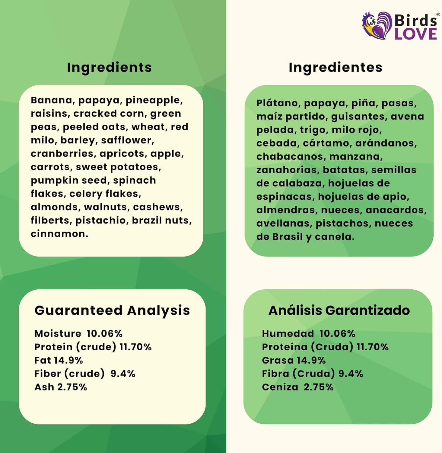 • No added preservatives nor sweeteners: natural sweet fruits to maintain healthy skin, muscles, and feathers