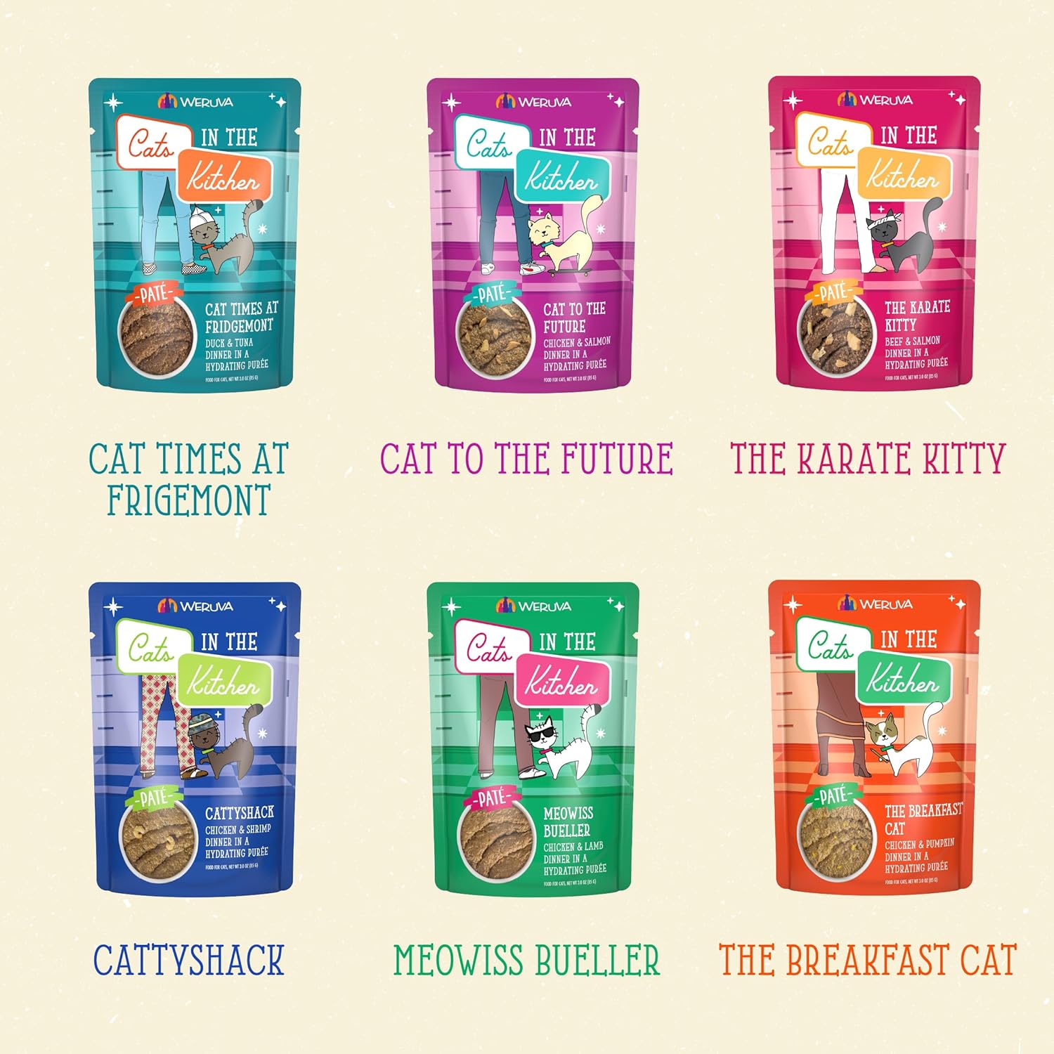 • Variety Pack includes 2 of each: The Breakfast Cat, Cat to The Future, Meowiss Bueller, Cat Times at Fridgemont, The Karate Kitty, and Cattyshack.