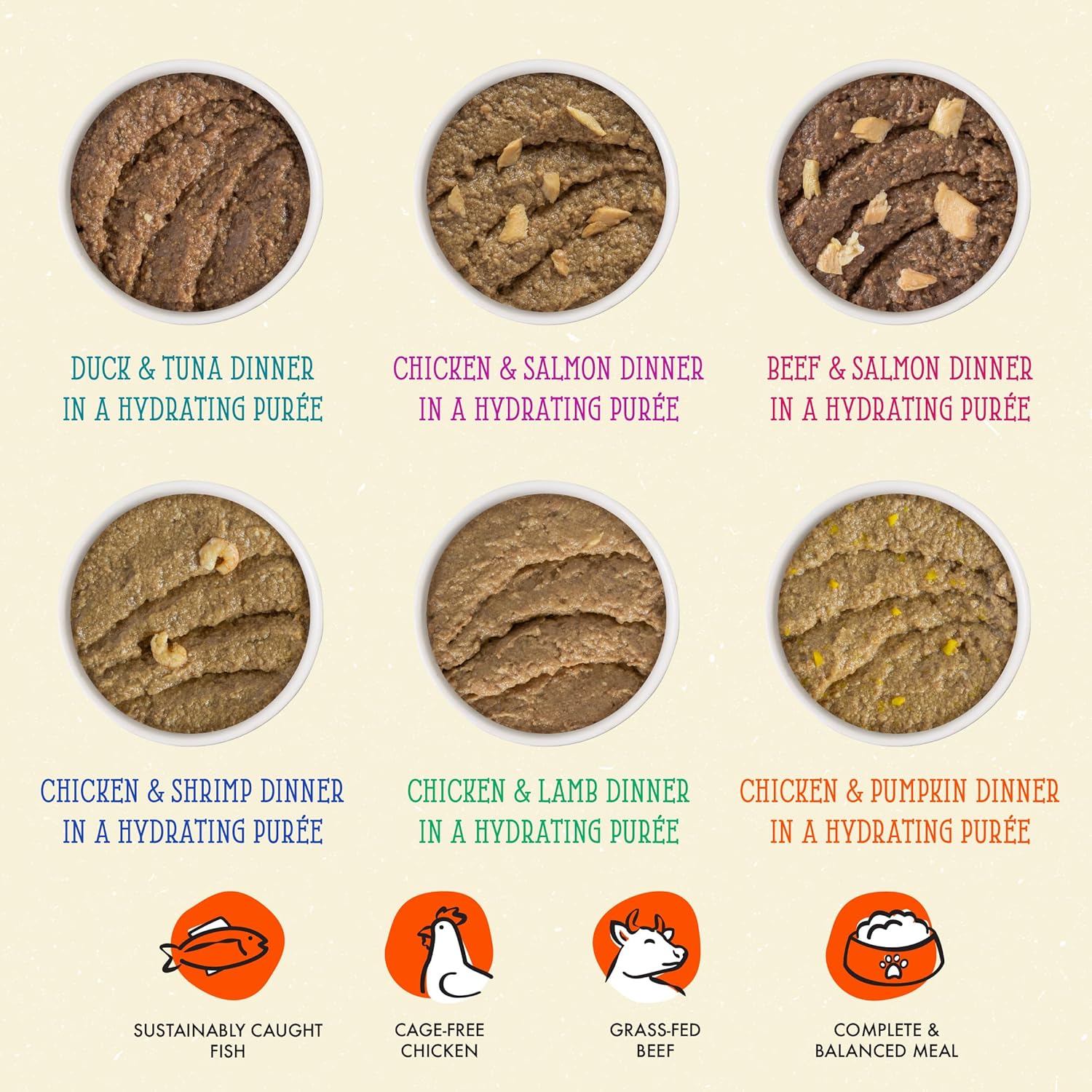 • The Brat Pack Variety Pack (3oz Pouch, Pack of 12) Featuring cage-free chicken, duck, grass-fed lamb, and wild-caught salmon gently pureed into a creamy and delicious pate. Convenient Slide N' Serve pouch makes meal time fun and easy!