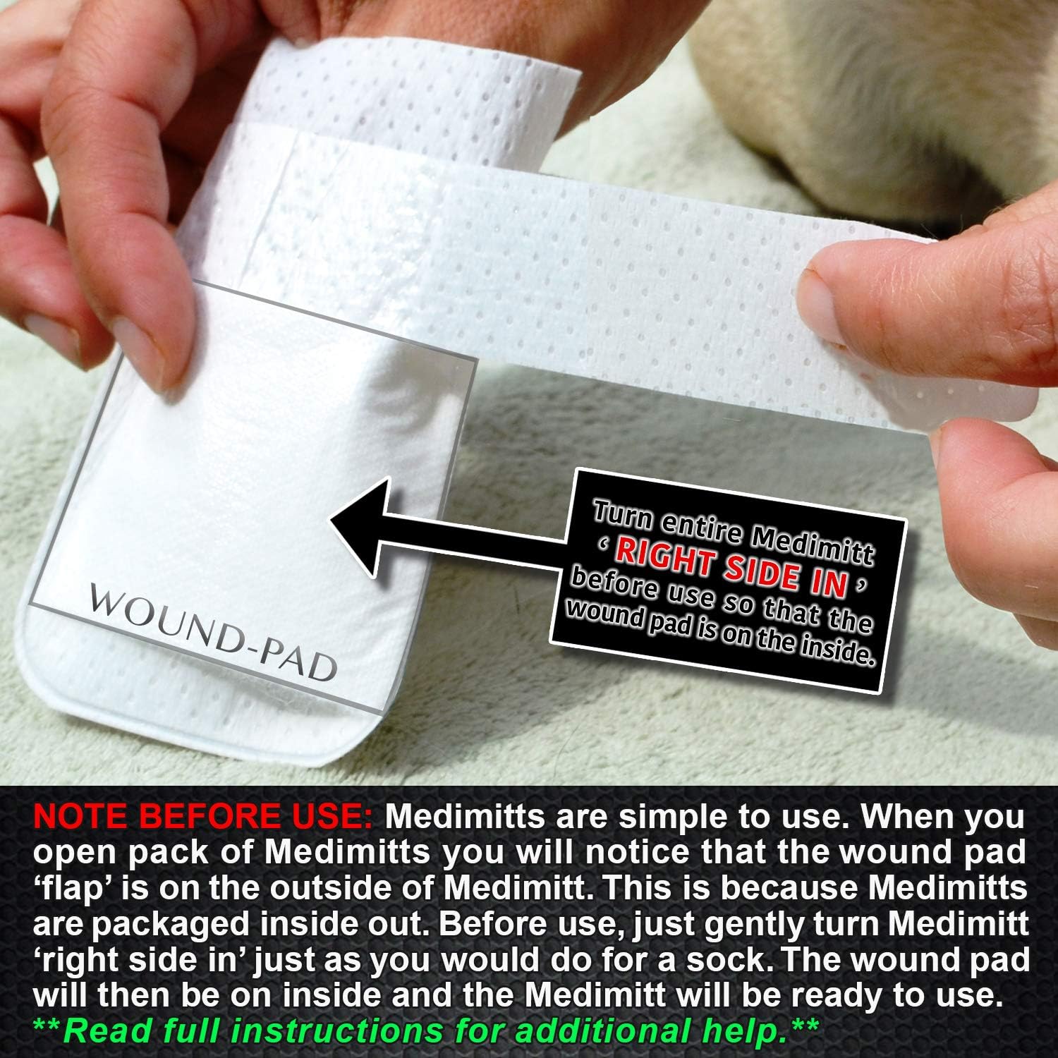 • SPECIAL NOTE FOR USE: PawFlex Medimitt paw Bandages are packaged inside out. For use, gently turn right side in so that the attached wound pad is on the inside. Direct the paw into the Medimitt and wrap non- slip Hook & Loop ADJUSTABLE STRAP fastening strap around pets’ wrist. Never wrap fastening strap too tight. The Medimitt will stay on with gently stretch.