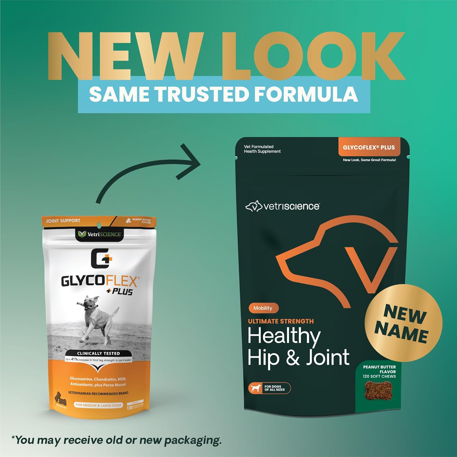 • Glucosamine for Dogs: Ultimate Strength Healthy Hip & Joint (previously GlycoFlex Plus) is our strongest hip and joint supplement for dogs, with powerful levels of active ingredients that work together to help maintain mobility, lubricate joints, and support flexibility