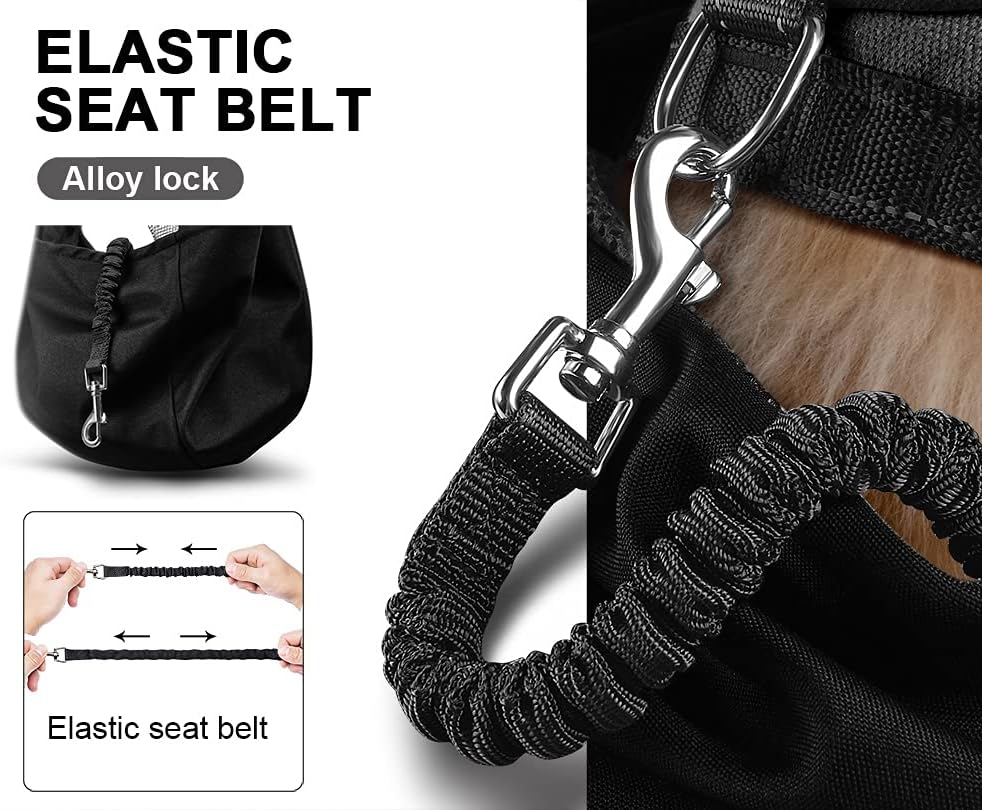 • Double protection device for safety buckle and safety mesh. Apply the harness or collar to the pet to prevent from jumping out suddenly. The safety buckle is connected with the spring rope, which plays a role of buffer and protection when the pet accidentally jumps out of the pet bag and reduces the shock to the pet . The opening of the net is adjustable , and the adjusting buckle is placed on the back of the pet , which is convenient for adjusting and is not easy to hurt the pet .