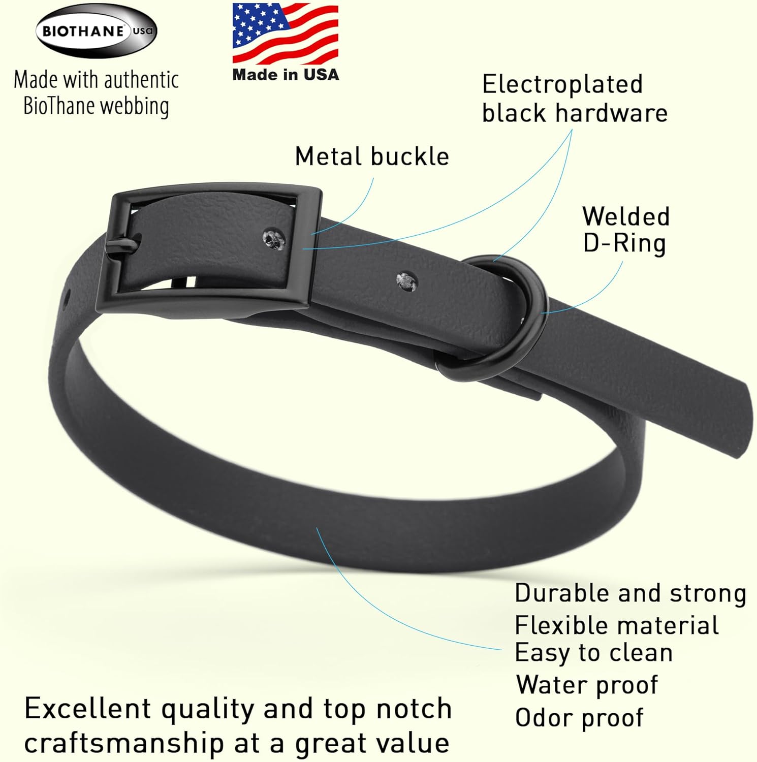 Dogline Biothane Waterproof Dog Collar Strong Coated Nylon Webbing with Black Hardware Odor- Proof for Easy Care Easy to Clean High Performance Fits Small Medium or Large Dogs, Black