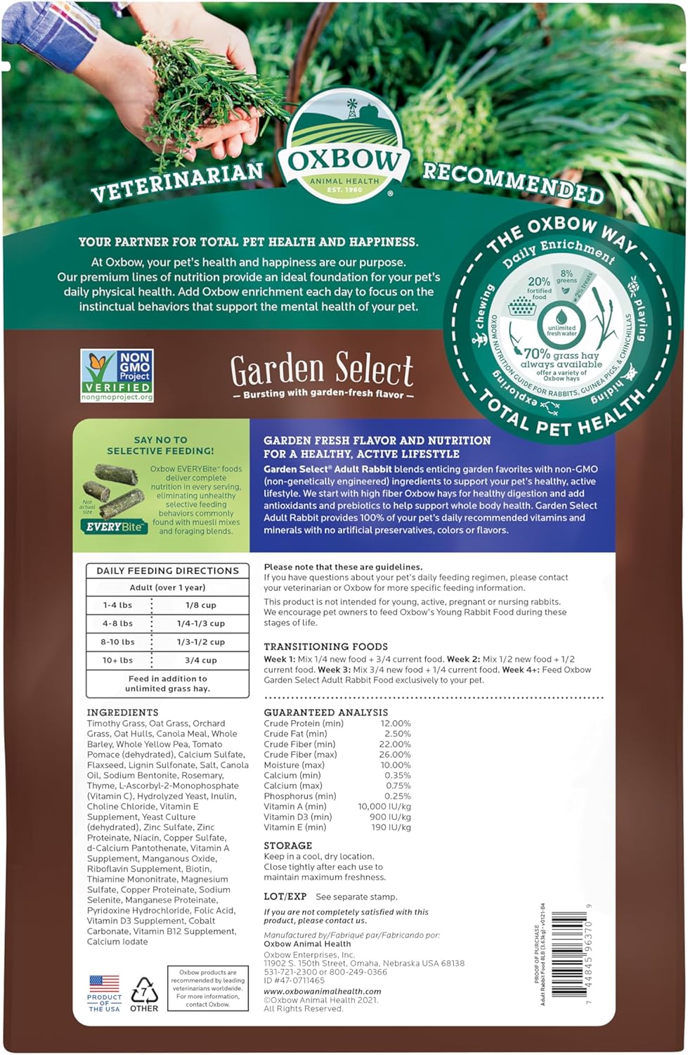 • NON-GMO: Oxbow Garden Select Adult Rabbit Food is made with non-GMO ingredients you can trust; These rabbit and bunny pellets provide a natural, unaltered diet that supports your pet’s health while meeting the highest standards of quality and care